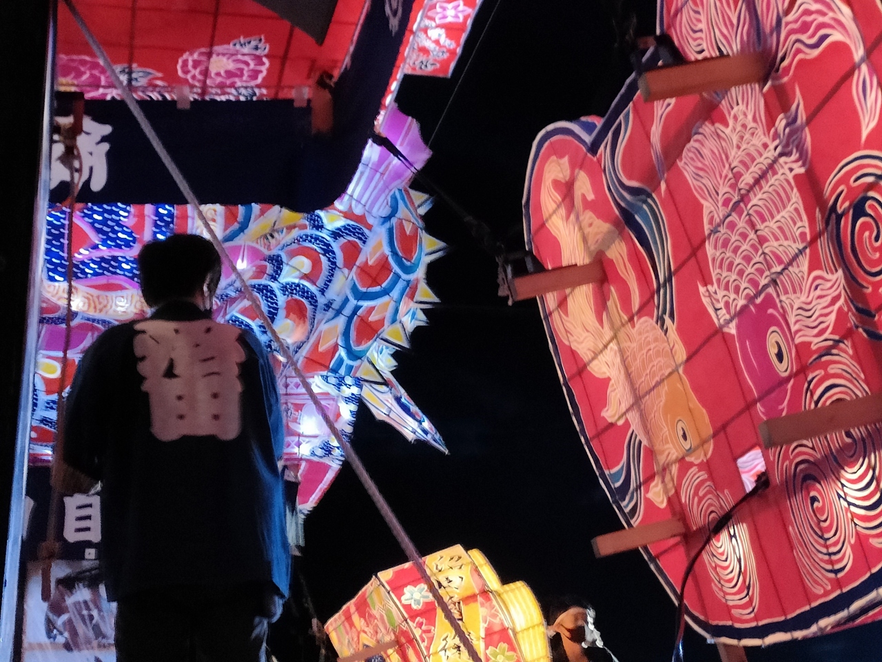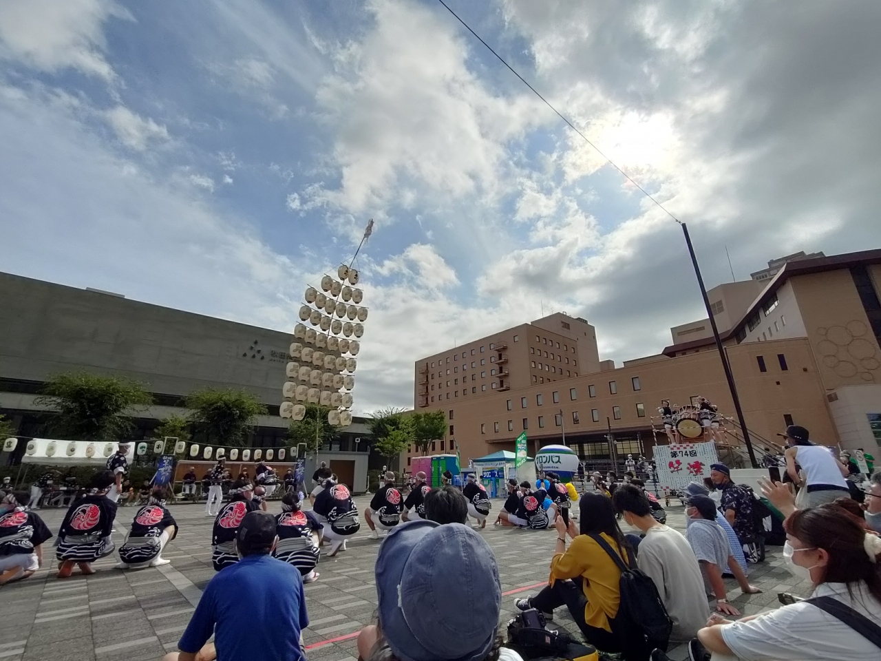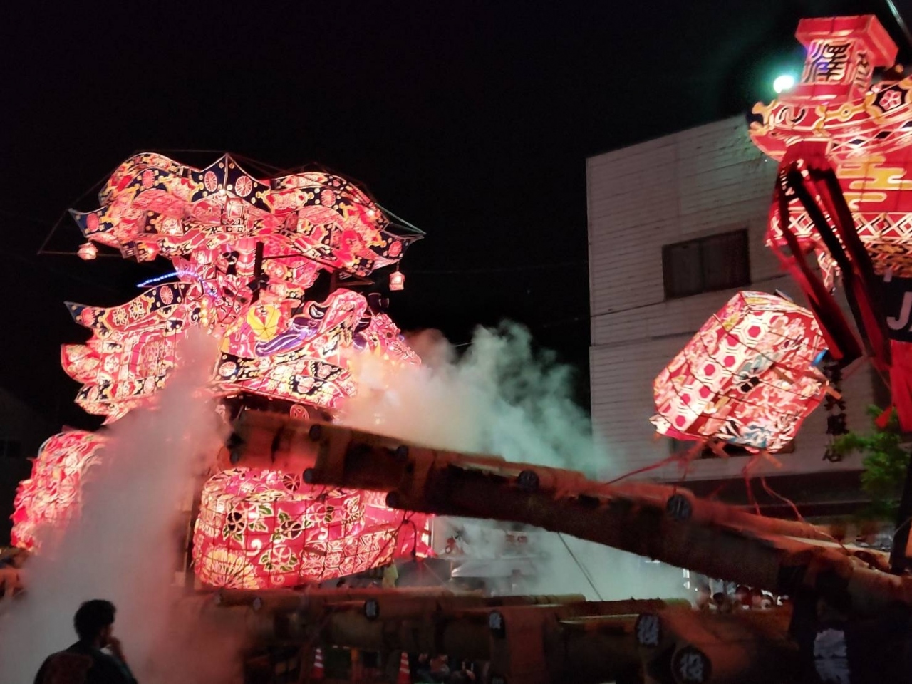 2022年、コロナ禍で自粛されていたお祭りが3年ぶりに開催とのことで、過去に見た時と比べて多くの人出で賑わっていました。夜になると大型の山車の行灯が点灯し、勇壮かつ壮麗な雰囲気を醸し出しますが、何といっても一番の見所はあんどんのぶつけ合い。A会場、B会場に分かれて3回ほどのぶつけ合いが行われます(2日目)。