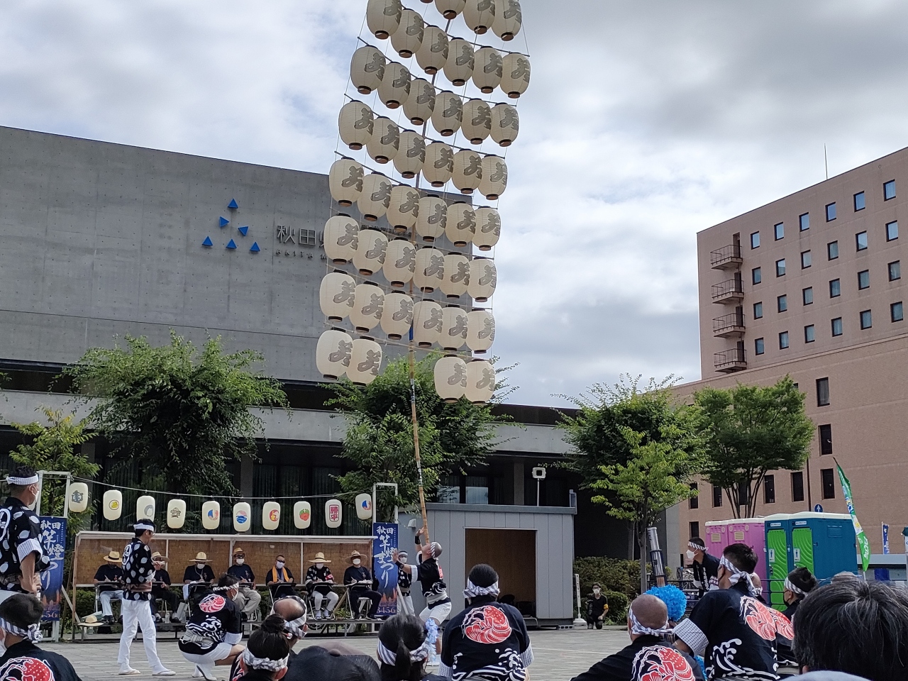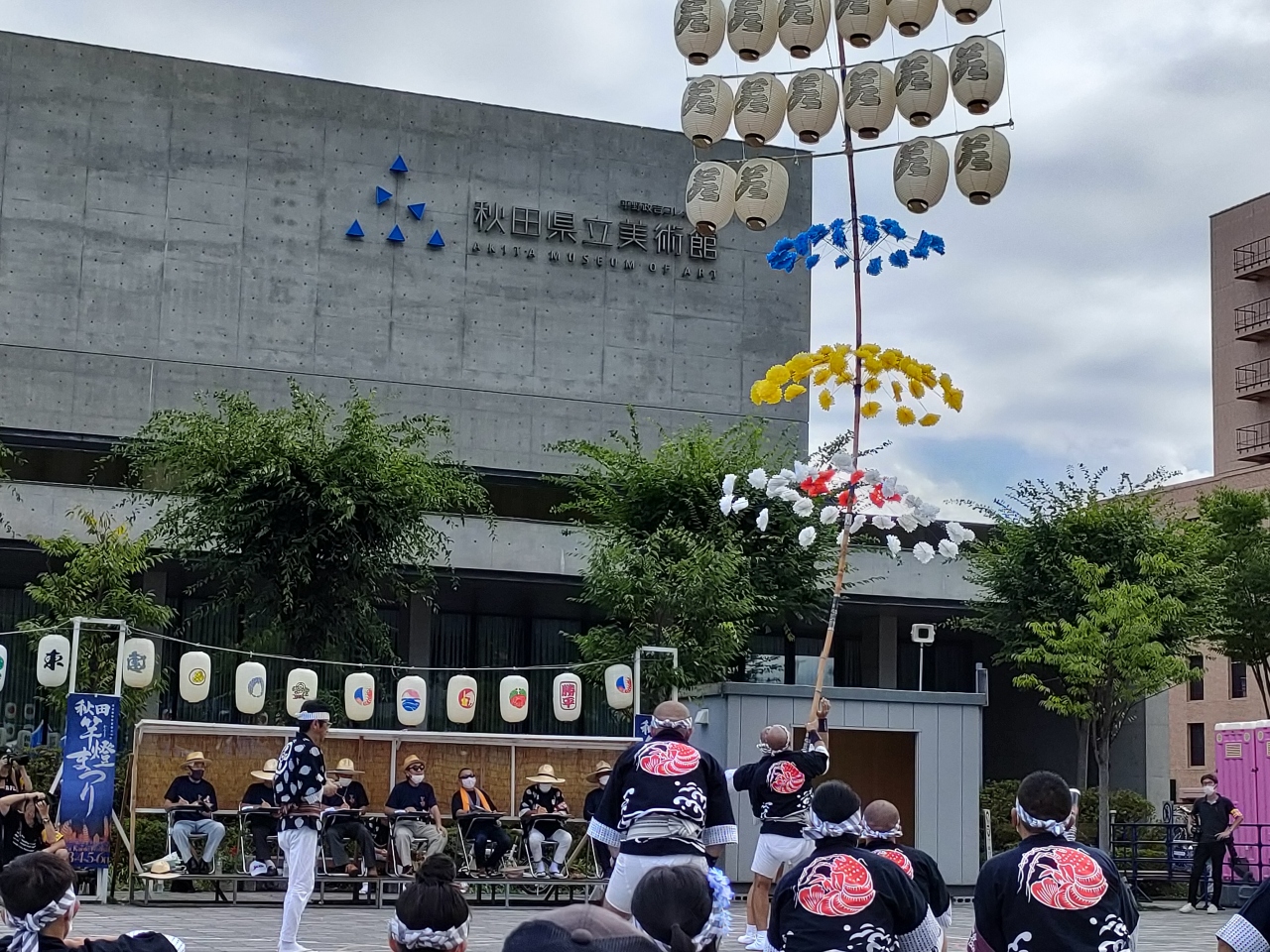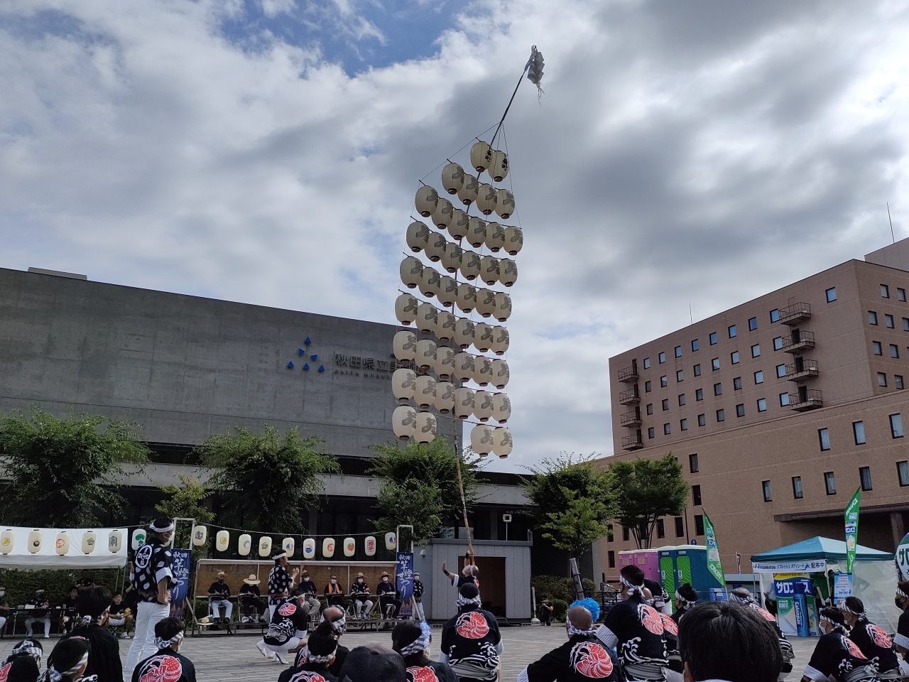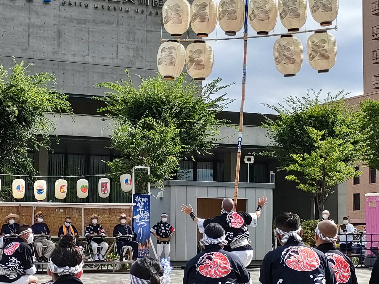 エリアなかいちは、県立美術館やにぎわい交流館AUがある辺りまで来たところで、竿灯まつりの時に訪れたところ、美術館前のにぎわい広場で、昼竿灯(妙技会)が開かれていたほか、途中の仲小路では健康器具の販促イベントや路上屋台などが行われていました。- 旅行時期