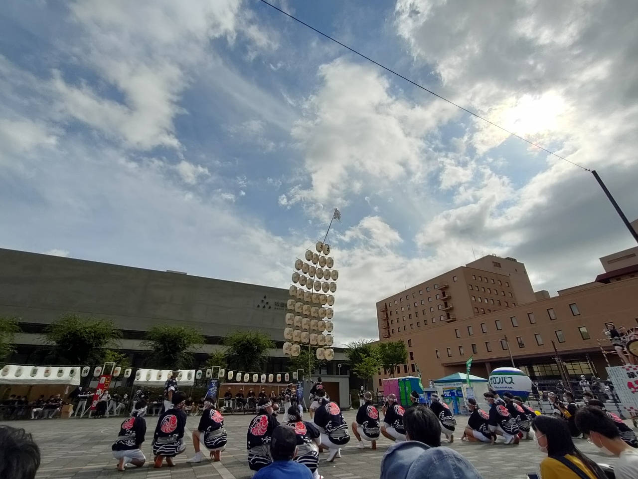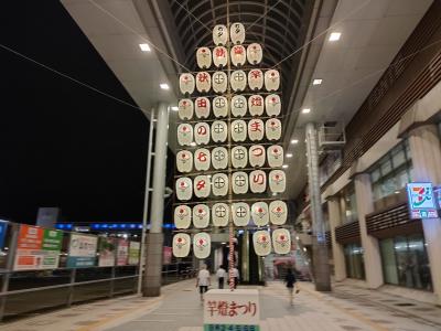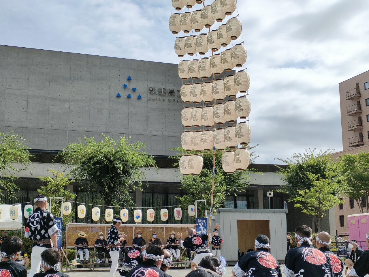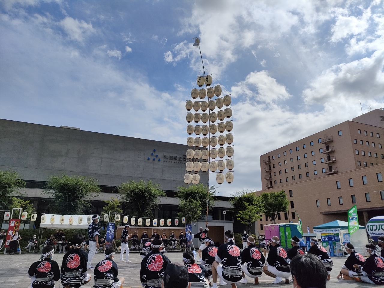 エリアなかいちは、県立美術館やにぎわい交流館AUがある辺りまで来たところで、竿灯まつりの時に訪れたところ、美術館前のにぎわい広場で、昼竿灯(妙技会)が開かれていたほか、途中の仲小路では健康器具の販促イベントや路上屋台などが行われていました。- 旅行時期