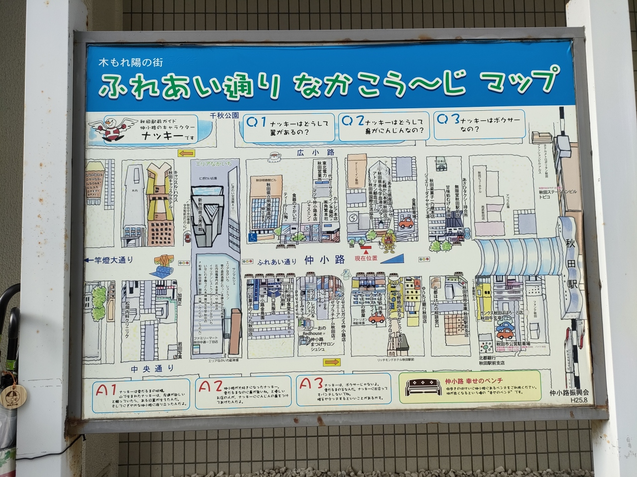 秋田駅の中央コンコースからまっすぐ、仲小路を行くと、アーケードや店舗の中を伝って山王大通り方面まで抜けることができ、広小路や中央通りに比べて、途中、屋根がかかる局面が比較的多くて、特に天気がイマイチな時など助かります。
