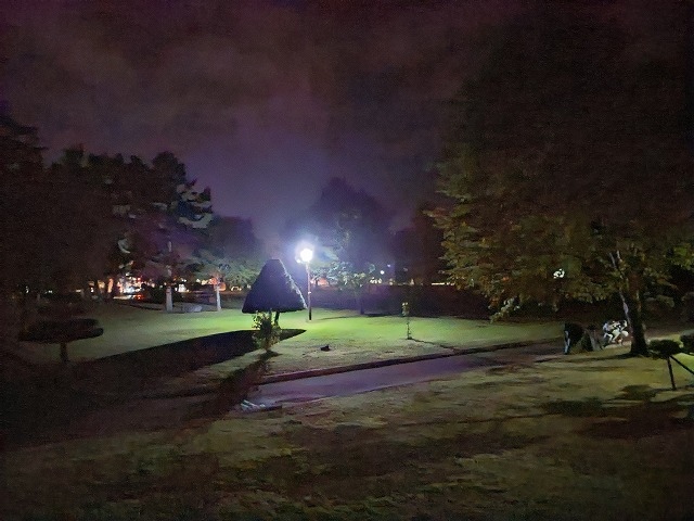 公園内には炊事場にトイレがあり、テントエリア付近にも夜間点灯する街路灯が2、3個ありました。お風呂は、同じ沼田町内にほろしん温泉があるものの、山間で12kmも離れているため、6.5kmほど離れた秩父別の道の駅の温泉が良いと思います。ほか、平地では、10kmほど離れた北竜の道の駅の温泉もあります。