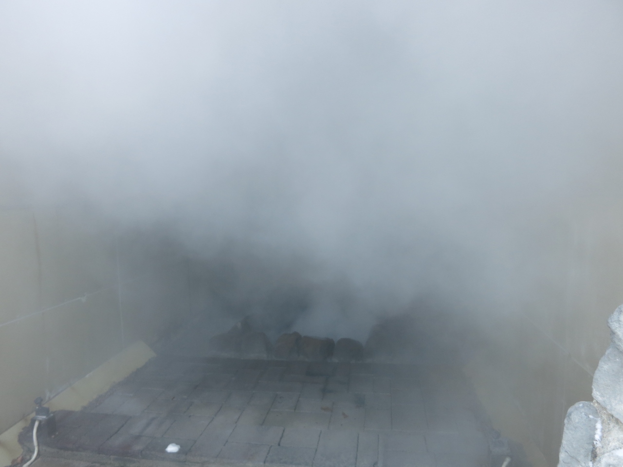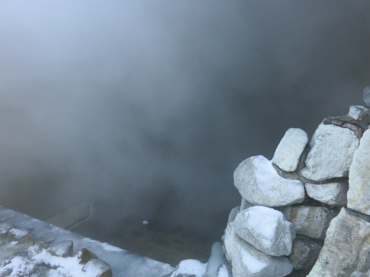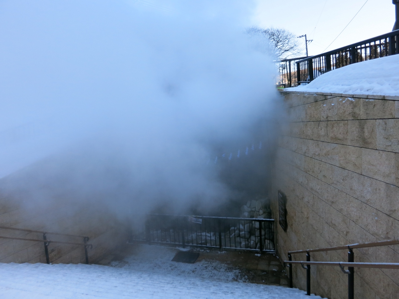 一方、B1の露天風呂は、囲われていたせいか、扉を開けた瞬間、湯気で何も見えません(眼鏡をかけていた訳ではありません)。広い浴場内はあちこちに浴槽が掘られていて、何も見えない中、ゲームのように進みます。足元は滑りやすく、結構危険です。扉を開けてすぐ、階段があったり、その横にはファミリー風呂ということで、滑り台があったりと、足で探るように進みました。入った瞬間、何も見えないので、横にそれて滑り台に行ってしまう人もしばしば見かけました。なお、気温が高い夏場は違うのかもしれません。