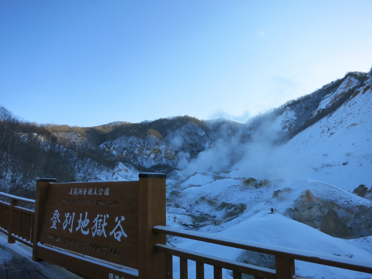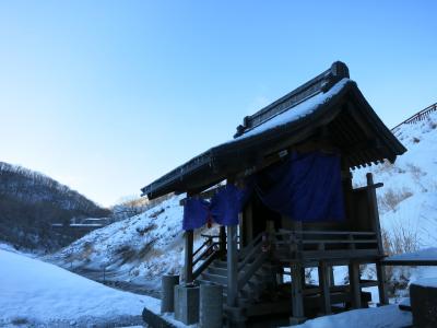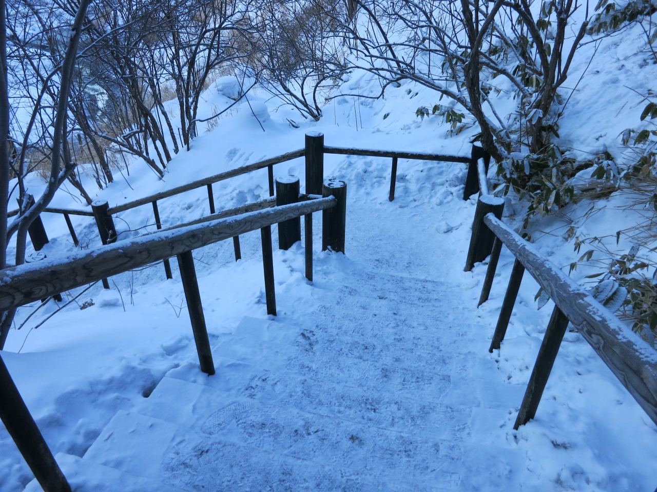 雪が積もる真冬も、通路は除雪されていて、行くことができます。ただ、積もった雪に掘られた階段などは、滑りやすいので注意が必要です。足元を照らすランプも設置されていて、夜でも行けるようです。