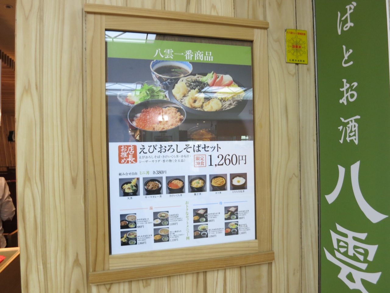 冷・温の各種うどん・そばがあり、天丼やキーマカレーが付いたセットメニューもあります。全品¥500円からなる、お子様セットというのもありました。ふりかけご飯、フライドポテトとジュースに各種そば・うどんが組み合わされたものです。