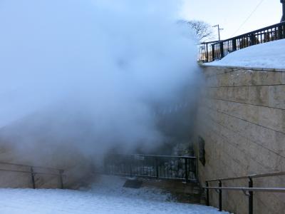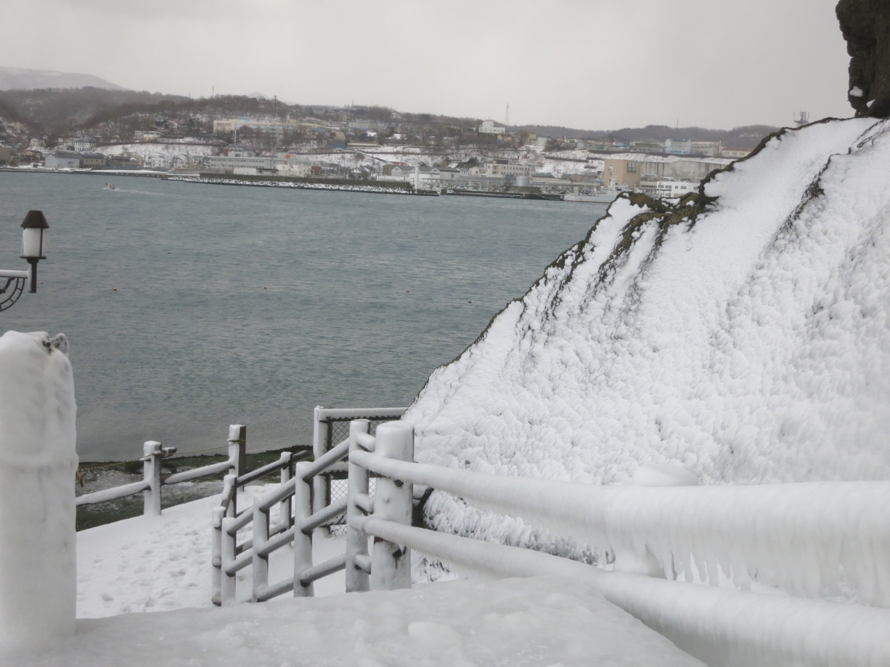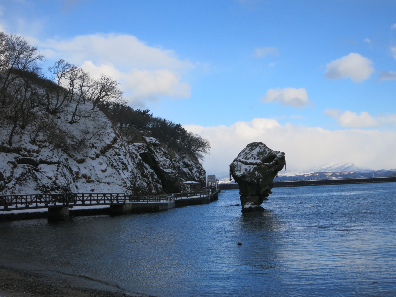 周囲2.6kmほどの鴎島ですが、20mほどの台地の上は比較的平らで、遊歩道も整備されています。ただ、冬は雪が積もり、台地の上へと上がる階段も滑らないよう注意が必要です。訪れた時は、人はおらず、台地の上の店舗も閉鎖されているようでした。ただ、比較的新しい足跡が雪の上に幾つもついていたので、真冬でも訪れる観光客がいるようです。
