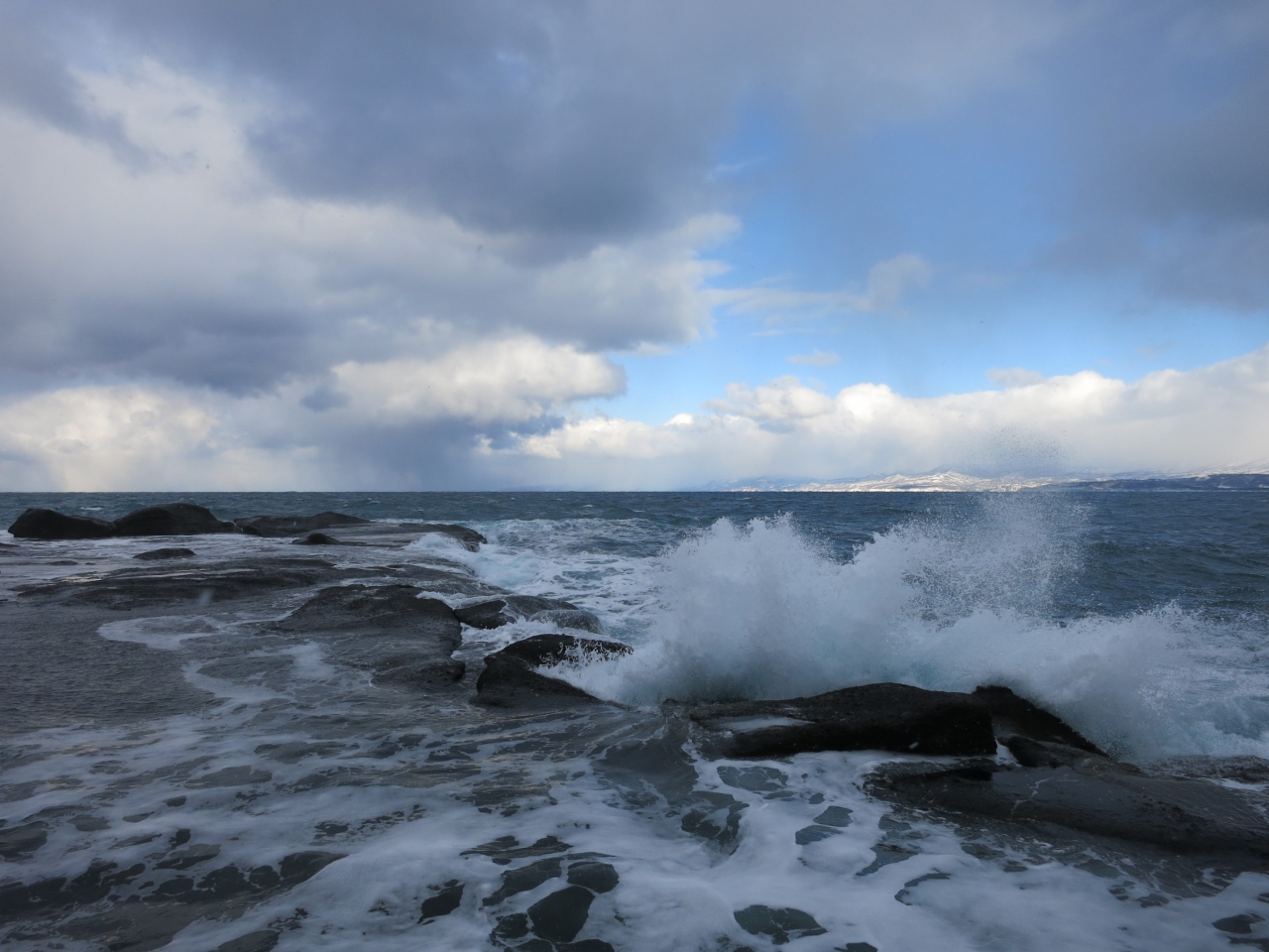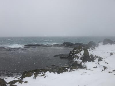 観光パンフレットなどにもあまり書かれていなかったので、鴎島に、意外にもこのような迫力のある景色の場所があったことに、少し驚きました。週刊読売の「新日本百景の地」との柱も立っています。島の西側は千畳敷と呼ばれる岩場が広がっています。冬に訪れたところ、時々吹雪模様となる中、日本海の荒々しい姿がそこにありました。島の上の遊歩道から見渡すことができます。灰色の空からは白い雪が降り積もり、黒々とした岩場に、打ち付ける白波とともにその陰影を際立たせていました。