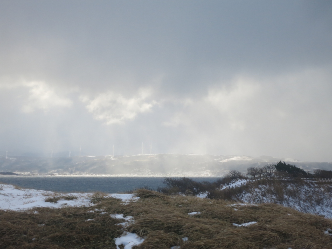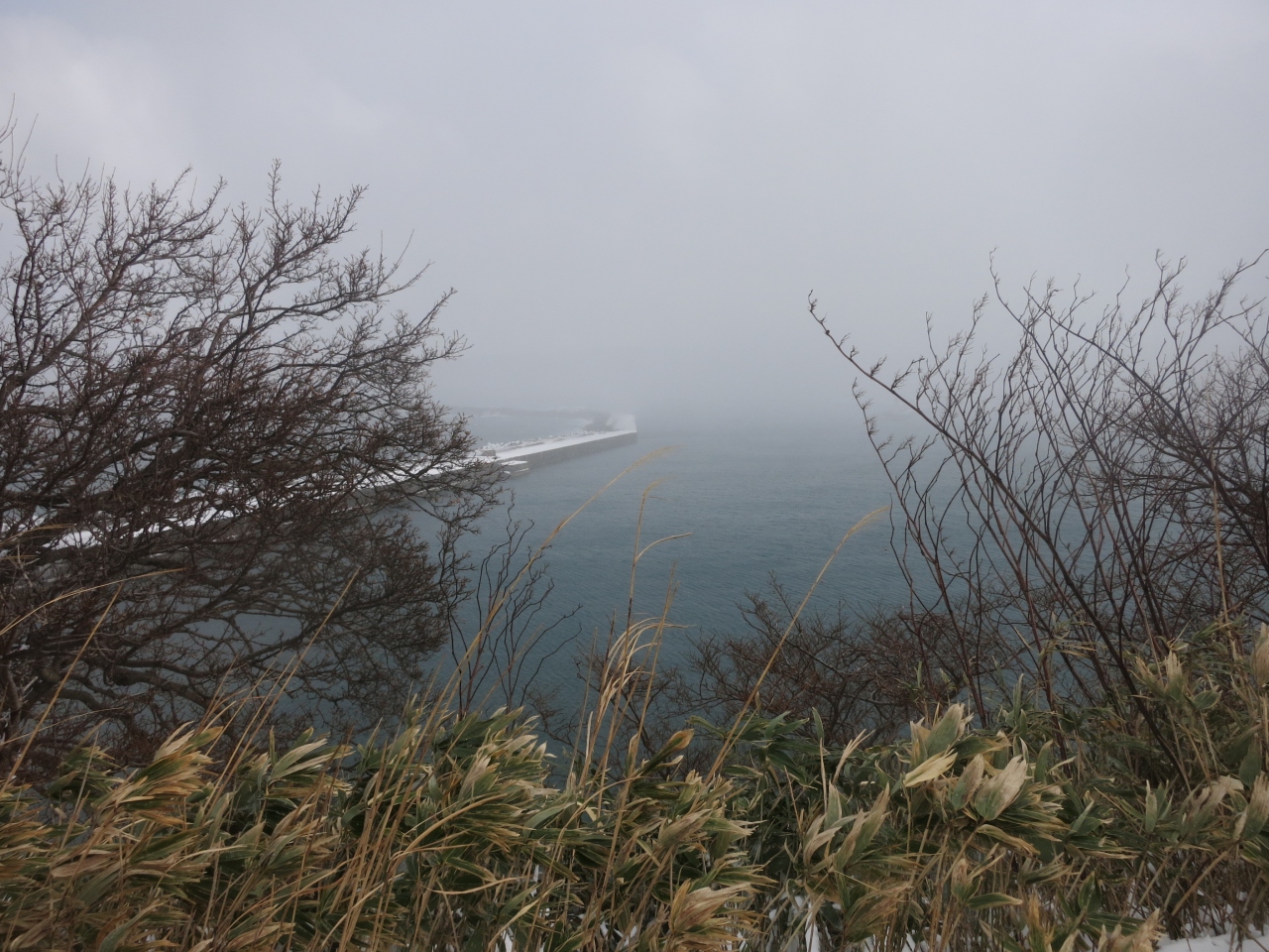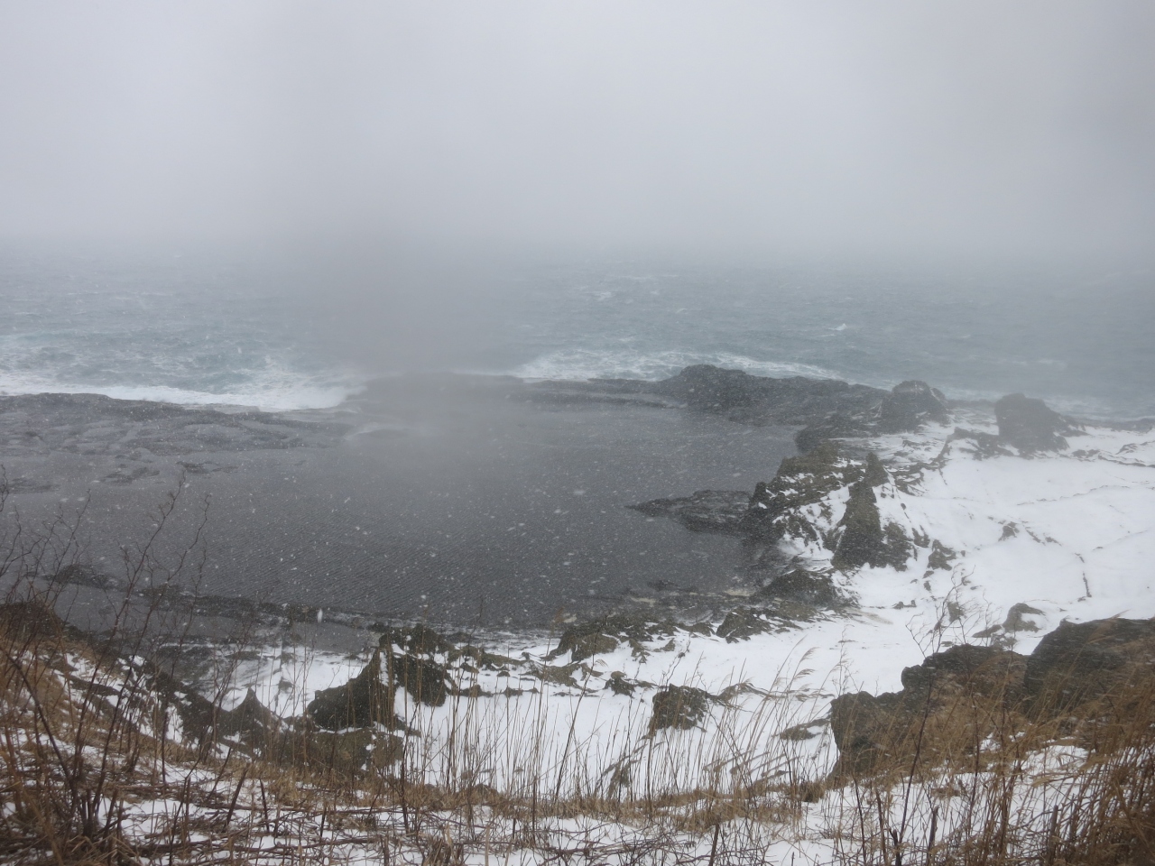 このような観光にはそぐわないと思われる悪天候の日でしたが、冬の日本海の光景のほかにも、良いものが見られました。波の花です。比較的、波の穏やかな入り江や岩陰に吹き溜まっていて、ときどき吹き込む強風を受けて、モコモコの泡が一斉にポポポーっと飛び立つ様子がとても愛らしい感じでした。波風の強い特定の条件の日にしか、見られないと思います。訪れた時は、北側の堤防を越えた波打ち際のあたりや、西側の小さな入り江のような地形のあたりで見えました。