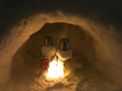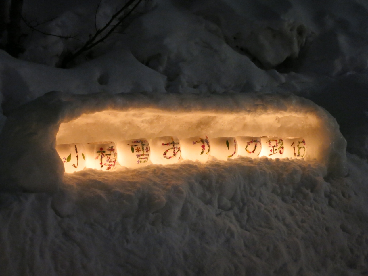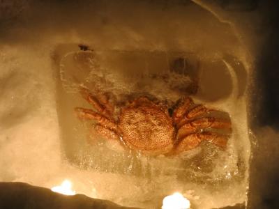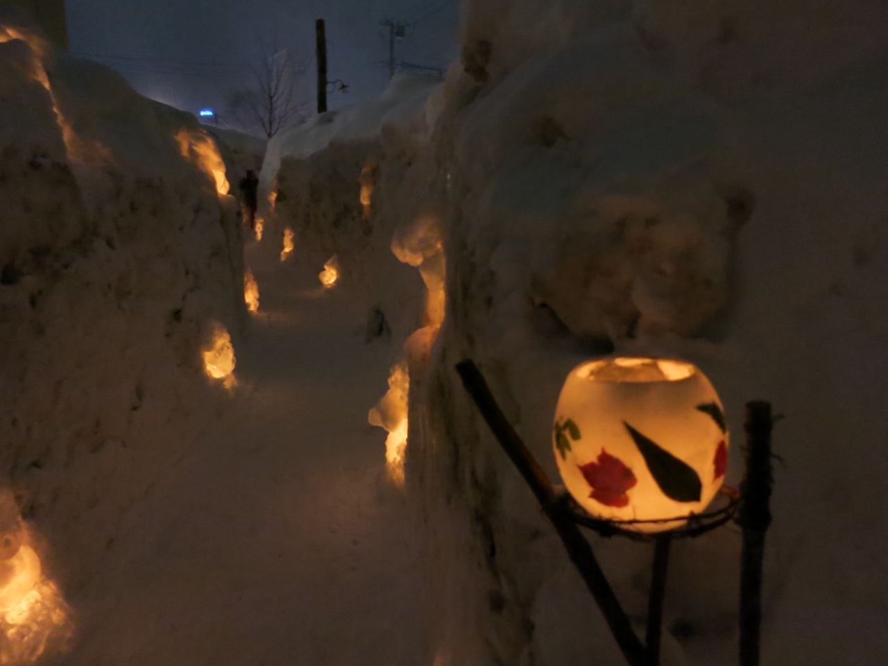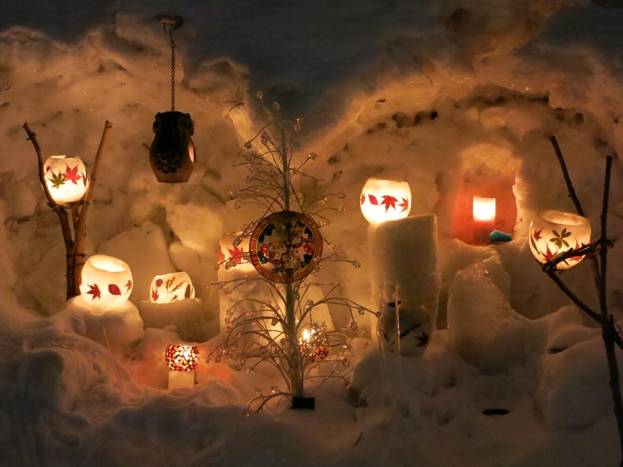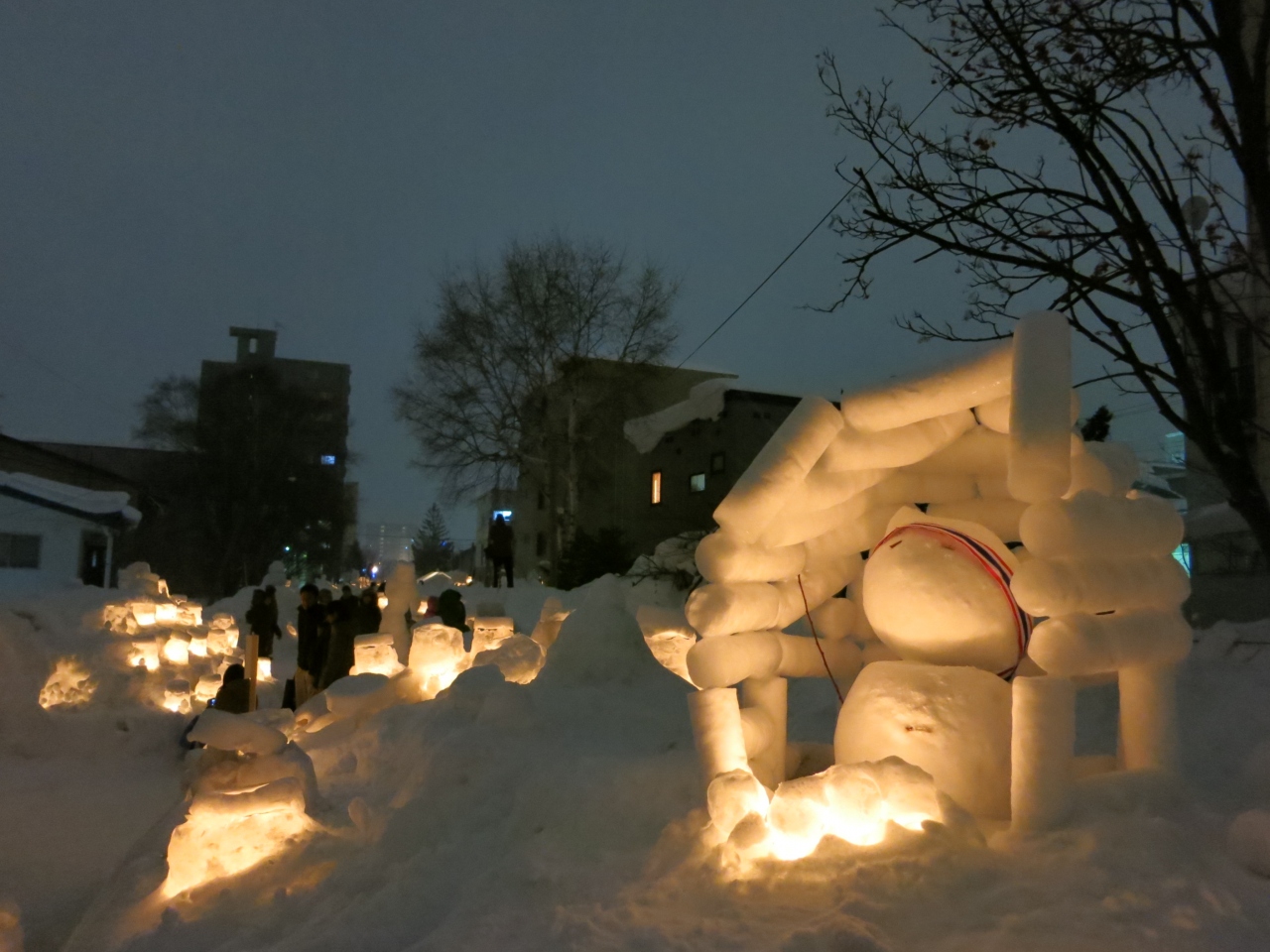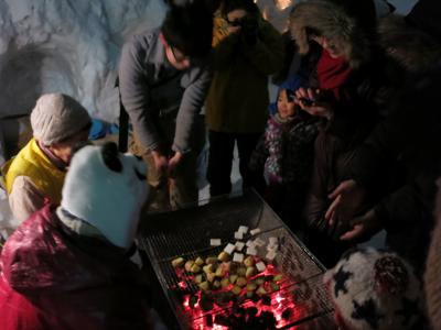 暗くなると、あちらこちらに氷で作られたランプシェードの中にろうそくの火が灯され、会場の小路をほのかに照らします。小さな可愛らしい雪像があったり、お餅を焼いて温まっていたりと、各所でミニイベントも開かれていました。- 旅行時期