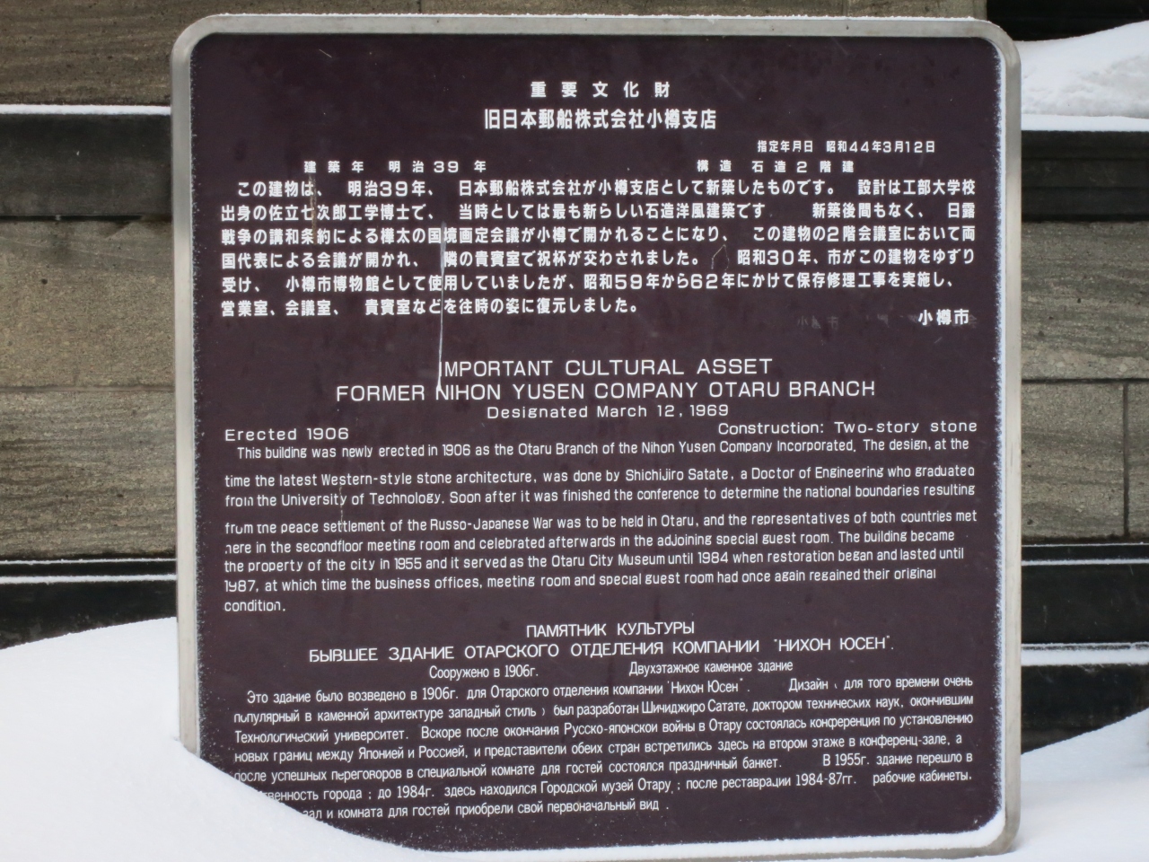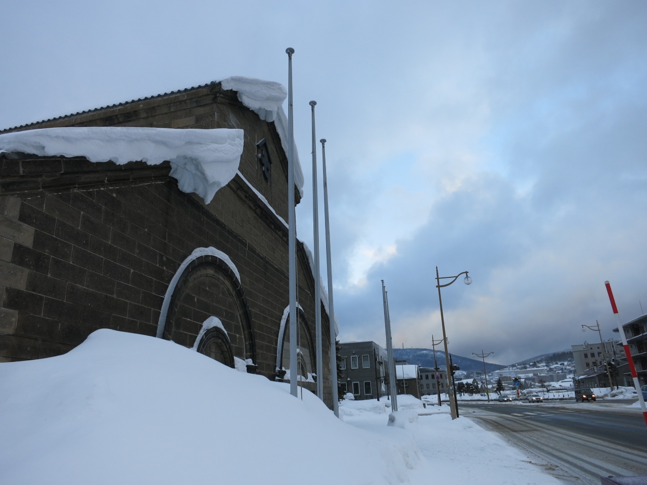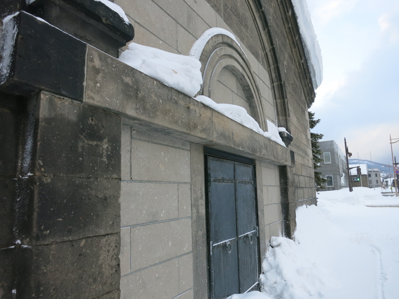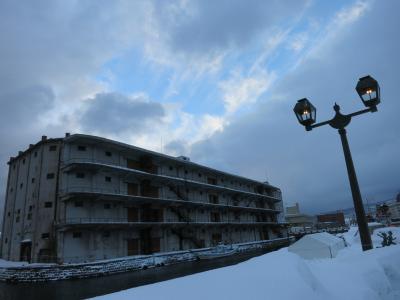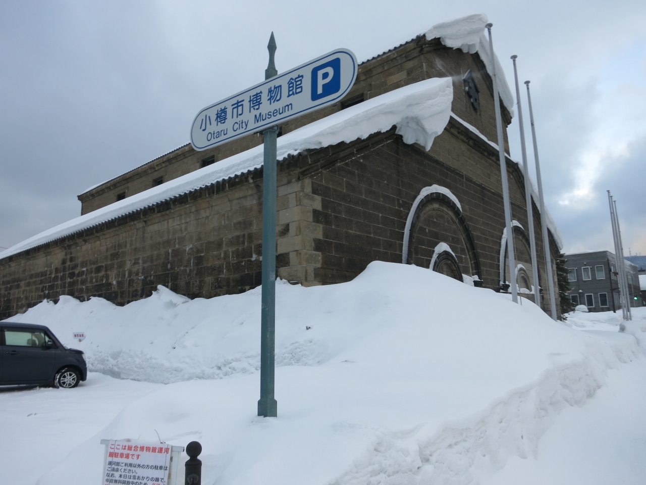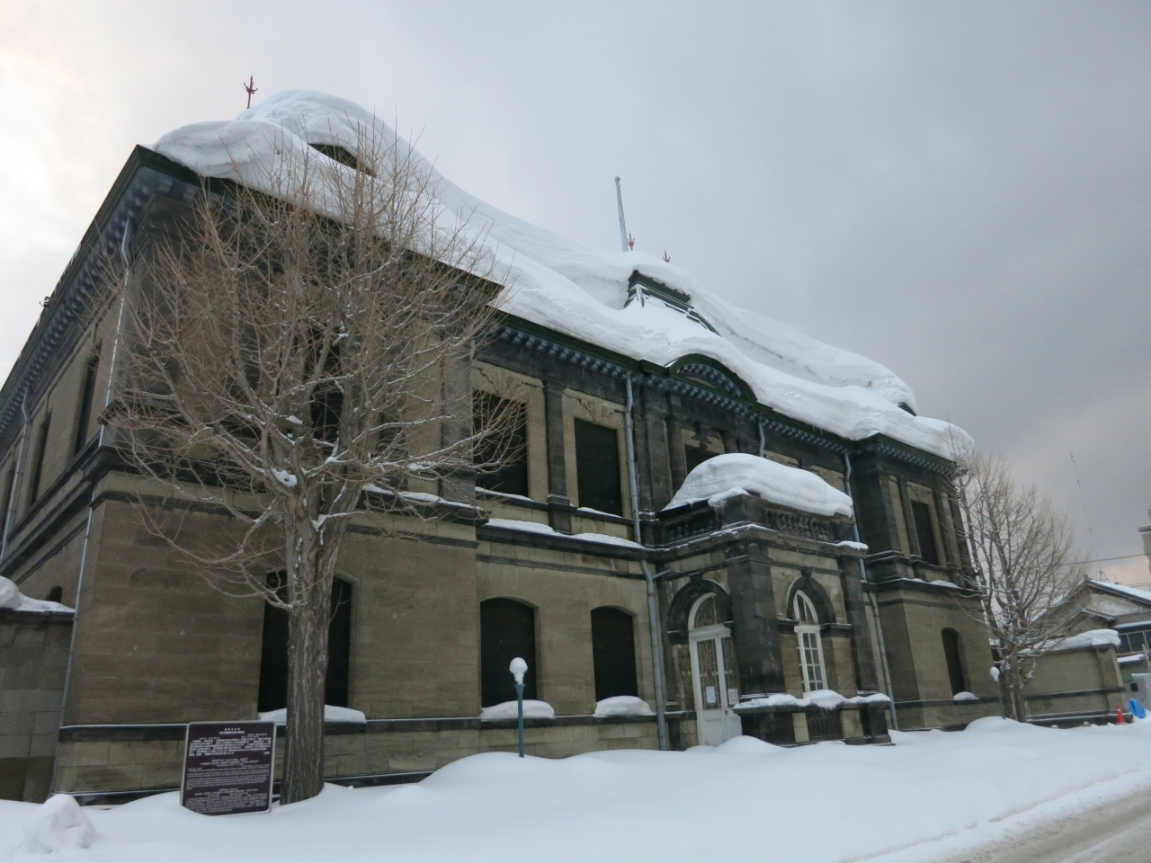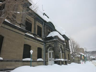 小樽市指定歴史的建造物に指定され、札幌軟石で作られたレトロな建物。小樽運河の北運河の方にあり、観光客もまばらです。更に訪れた時は、平成26年(2014年)3月31日まで工事のため、休館中とのこと。現在のところ外観を眺めるにとどまります。なお、冬場は建物の前に広がる運河公園も深々とした雪に覆われ、立ち入ることもできませんでした。
