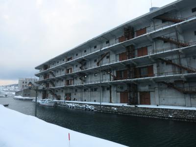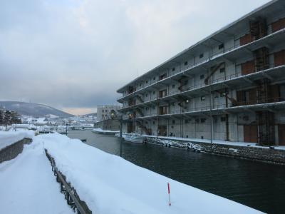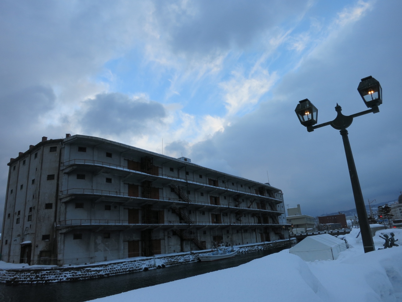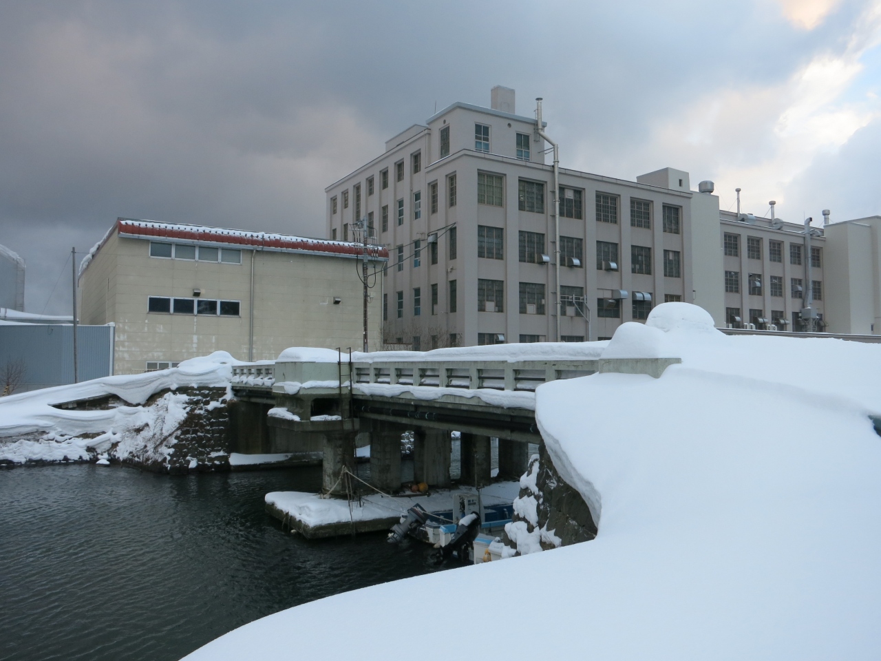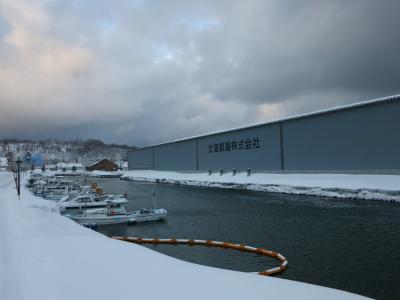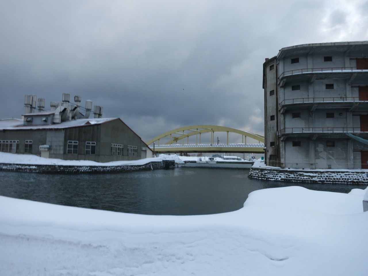 一方、北側は一転して人通りがありません。運河沿いの広い道路、道道454号線が離れてしまうと、運河沿いには遊歩道は整備されているものの、無機質な現代の倉庫が建っていたり、プレジャーボートや漁船が係留されていたりと、実用的な水路の様相です。その遊歩道も冬場は雪が積もって、狭く歩きにくいです。