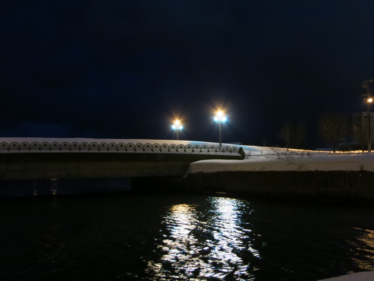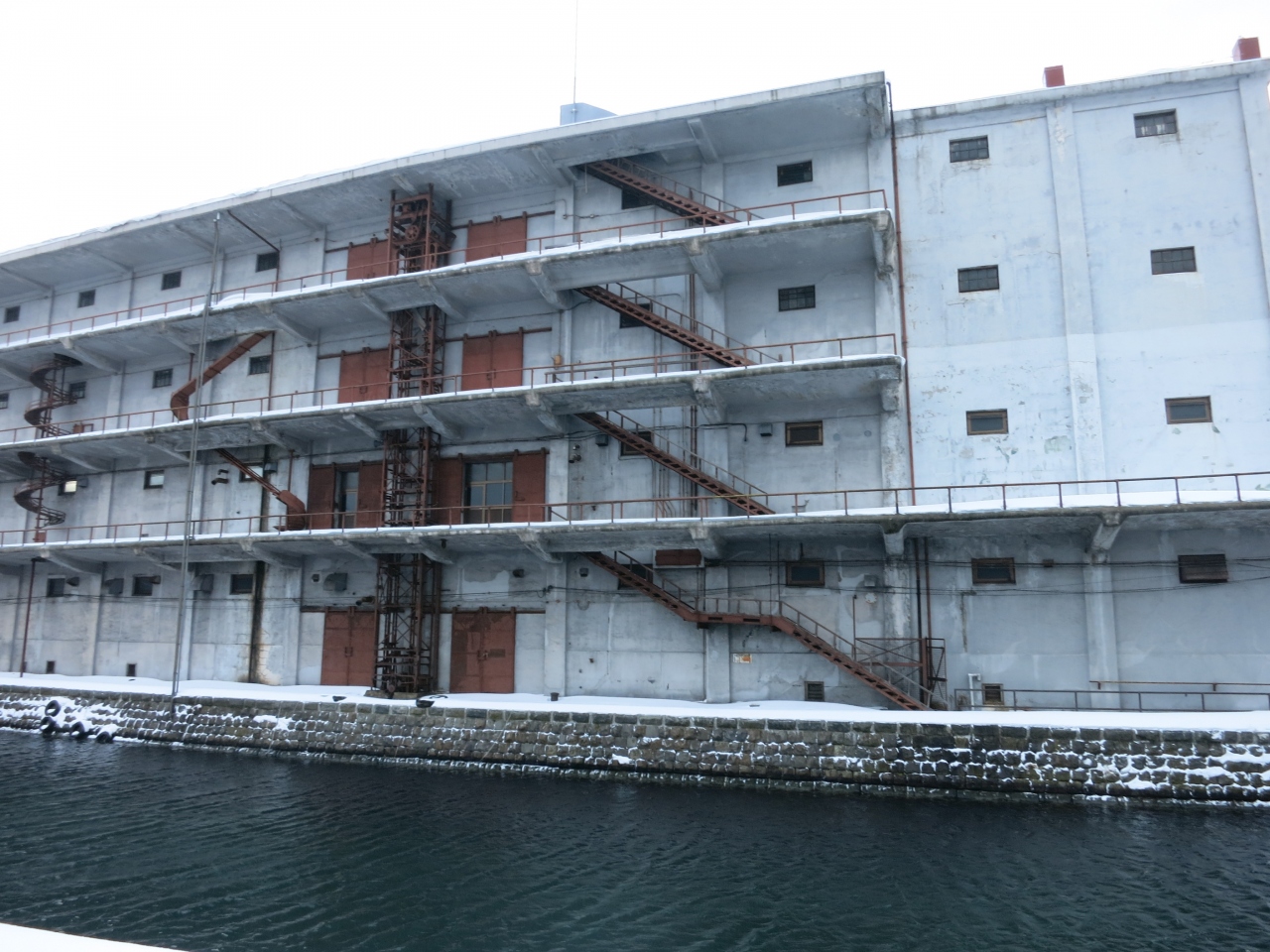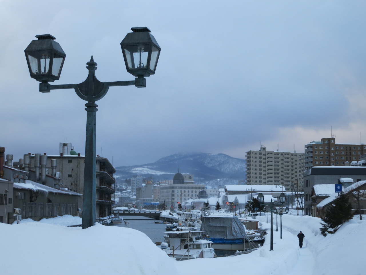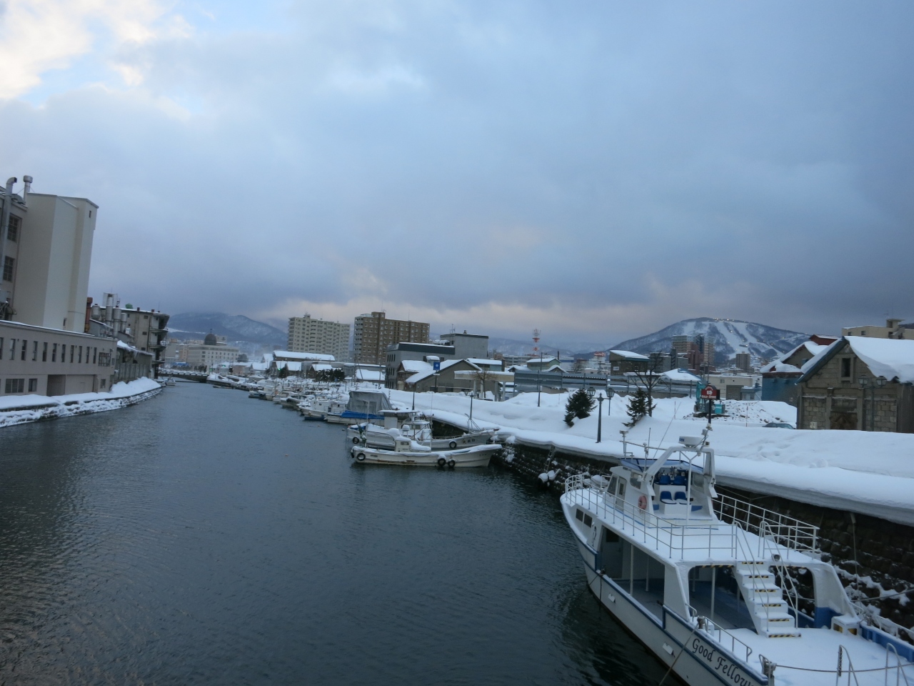一方、北側は一転して人通りがありません。運河沿いの広い道路、道道454号線が離れてしまうと、運河沿いには遊歩道は整備されているものの、無機質な現代の倉庫が建っていたり、プレジャーボートや漁船が係留されていたりと、実用的な水路の様相です。その遊歩道も冬場は雪が積もって、狭く歩きにくいです。