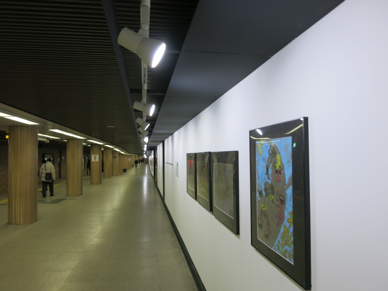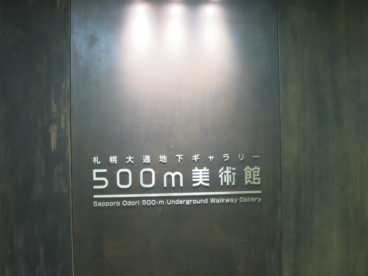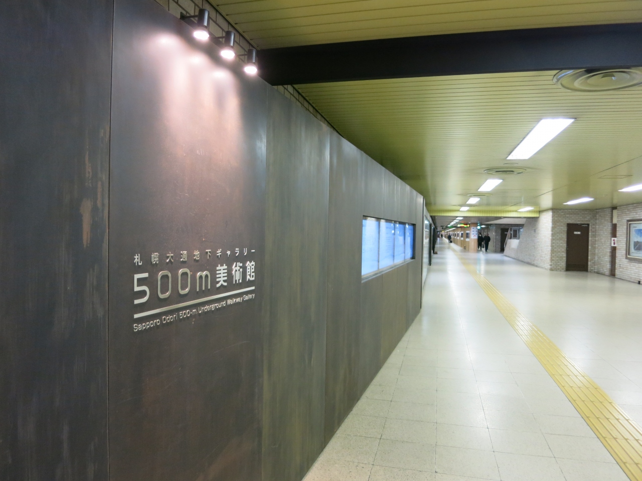 大通の地下街は、南北にはJR札幌駅の北側から地下鉄南北線、すすきの駅まで広がっていますが、東西には大通公園のところでは、西5丁目から東5丁目まで伸びています。地下鉄の大通駅と大通バスセンター駅は地下通路で結ばれています。500m美術館はその間の殺風景な壁を飾っています。