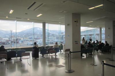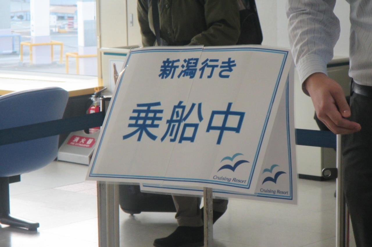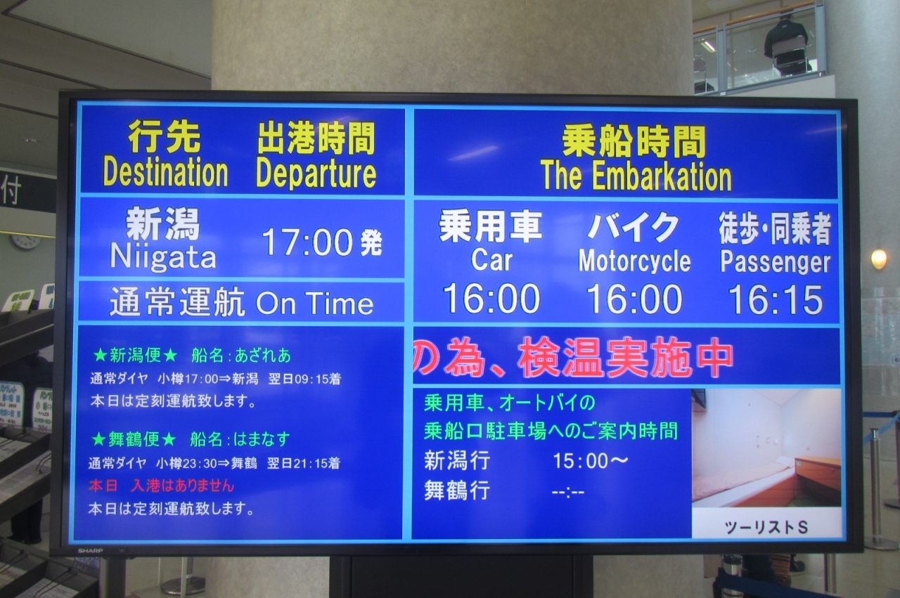小樽港(フェリーT 1階に窓口、3階に乗船口)から乗船したのですが、ホームページに乗船者は1時間前到着の推奨、30分前締切となっていましたが、きっと窓口ではそうなのでしょうが、実際に歩行者が船に乗れる(乗船開始)のは、ターミナル3階乗船口でおおよそ30分前になってからでした。