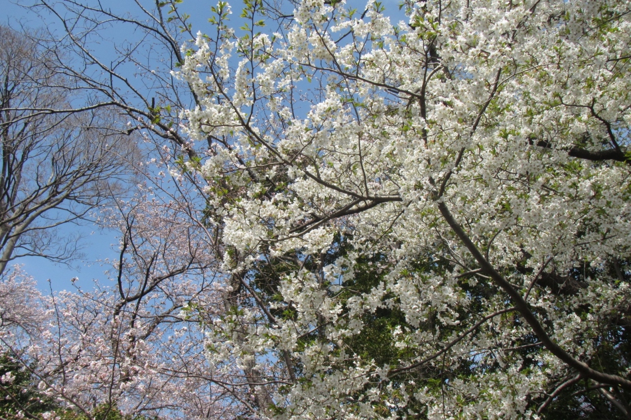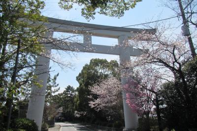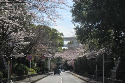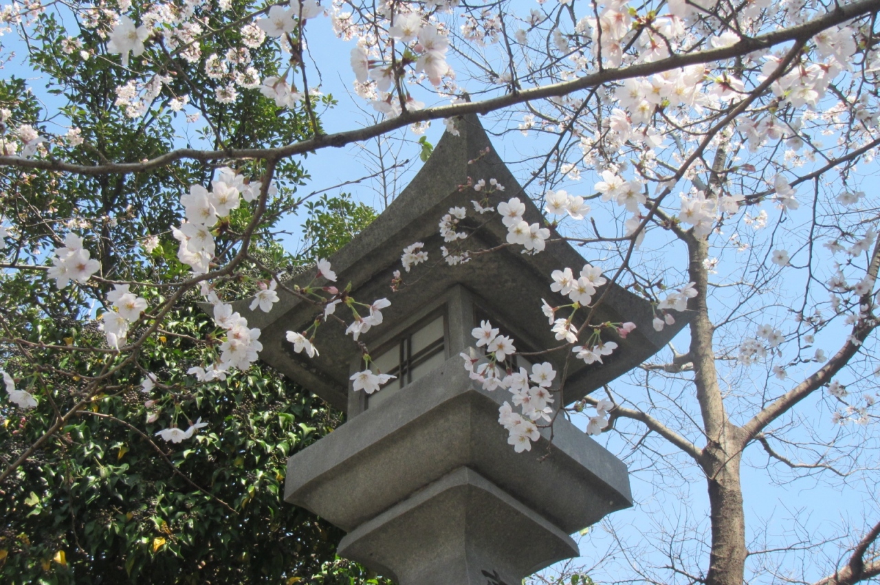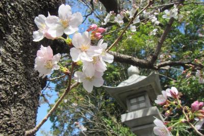 やや常緑樹が多い神社境内ですが、参道と合わせてところどころに桜が咲きます。