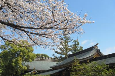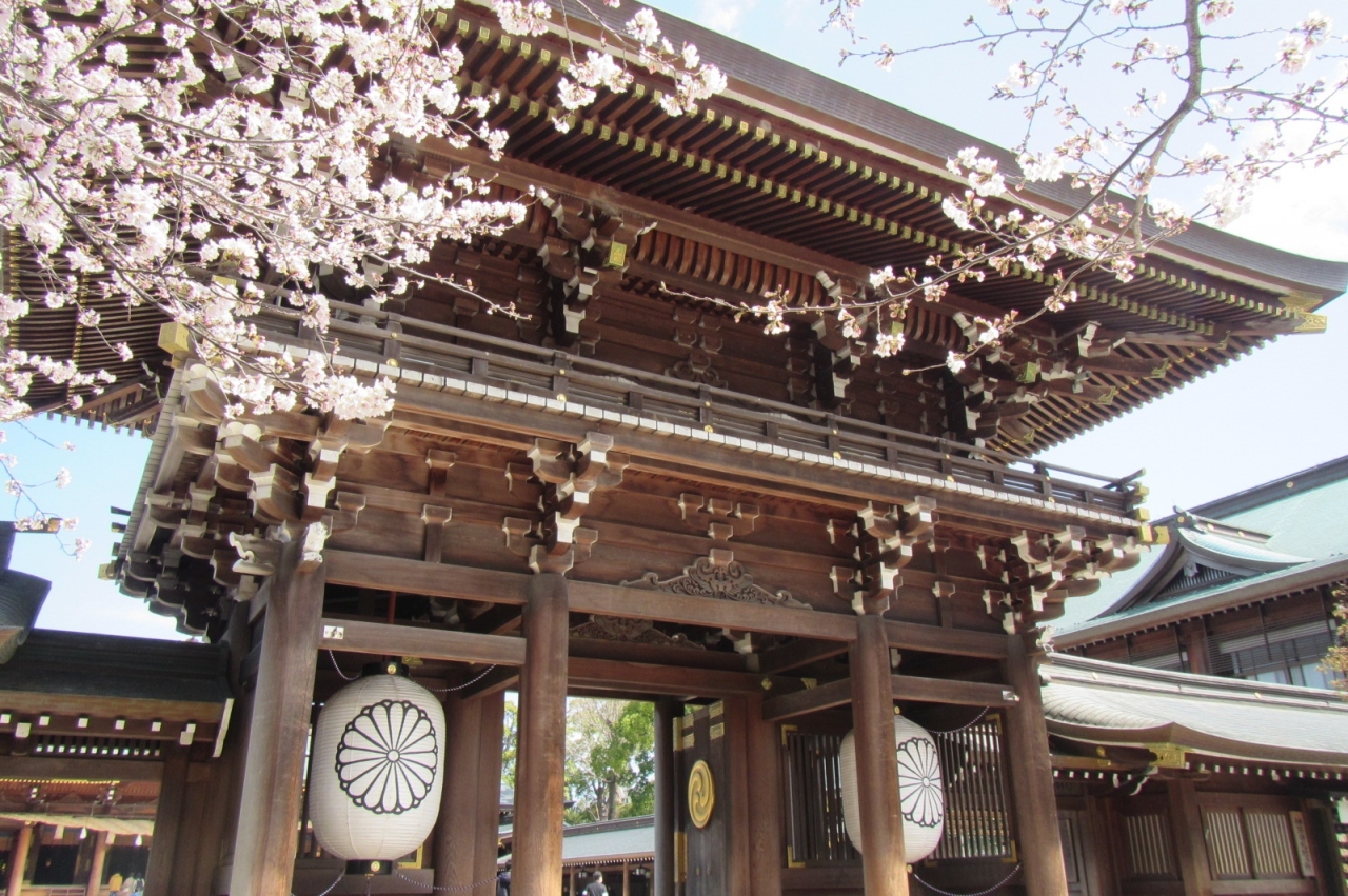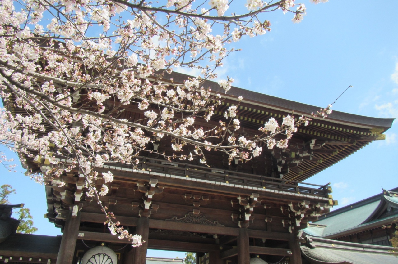 参集殿の前や山門の前にも桜があって、和風の建物と桜の花がよく似合っていました。