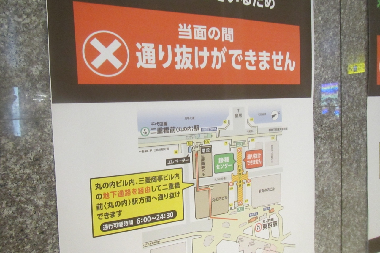 地下で行くなら、駅から左にそれて、丸の内ビルおよび三菱商事ビルの地下通路を通って二重橋前駅のところに出ますが、ちょっと不便でした。- 旅行時期