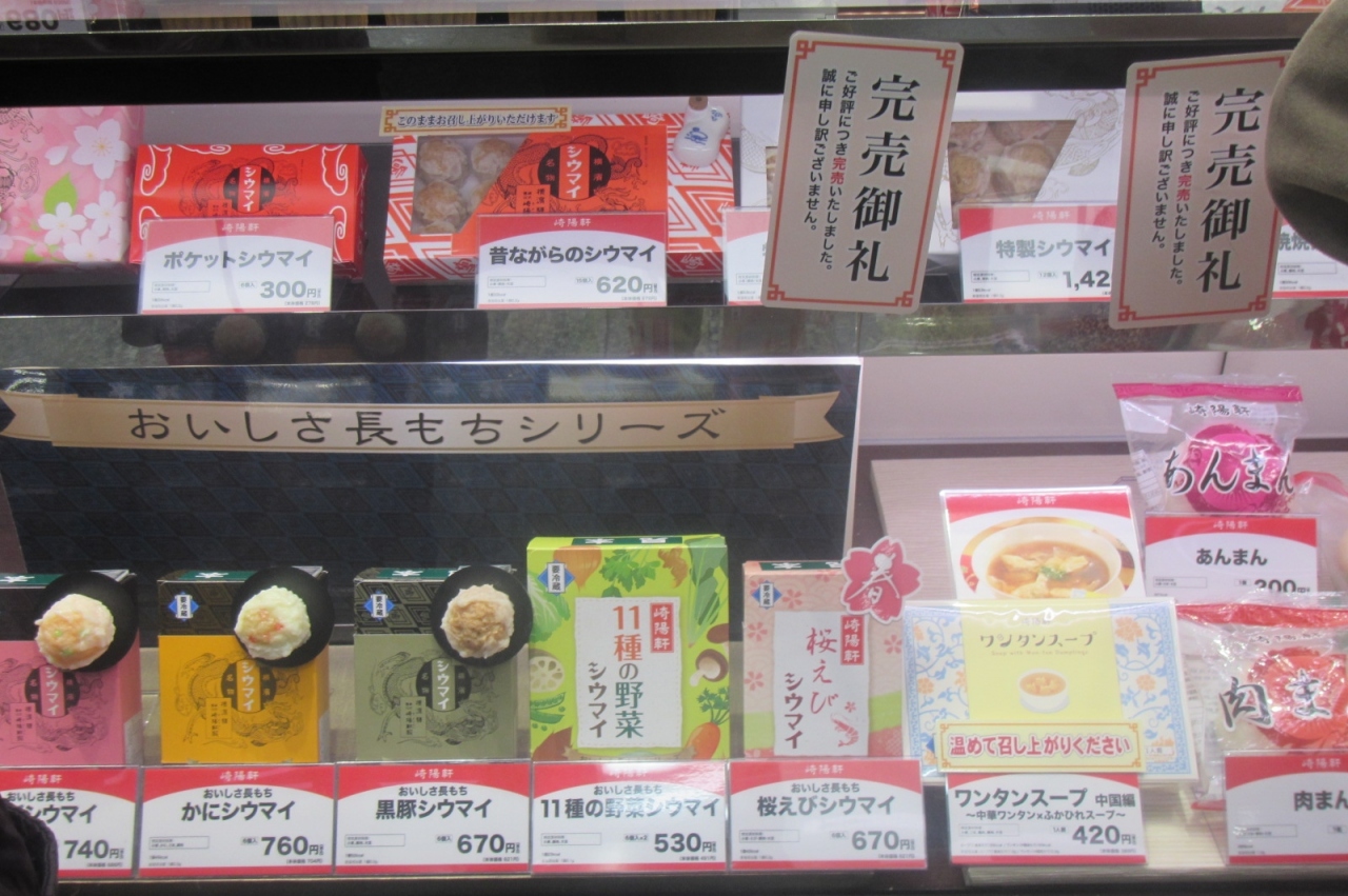 昔ながらのシウマイのほかに、黒豚、かに、桜えびなどの単品のシウマイのほか、シウマイ弁当、月餅、調理用の肉まん、あんまんなどを売っていました。