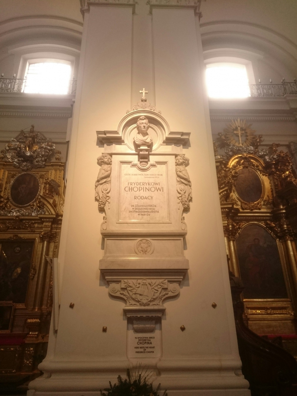 外の賑やかさとは一転、教会内部は静かで、神聖な雰囲気が漂っています。写真を撮るのをためらってしまうほどでした。ここはショパンの心臓が置かれていることで有名ですが、さりげなくその柱が立っていたのが想定外でした。ショパン好きでなくても足を運ぶ価値はあると思います。