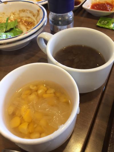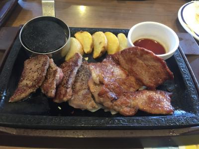 ランチメニューにはランチバーが付いているのだが、サラダが食べたくてサラダバーをつけた。ステーキと三元豚が971円。サラダバー追加は216円プラス。これでスープ、デザート、カレーライス、そうめん、サラダバー、デザート、パンまで食べ放題。大変お得で楽しかった。