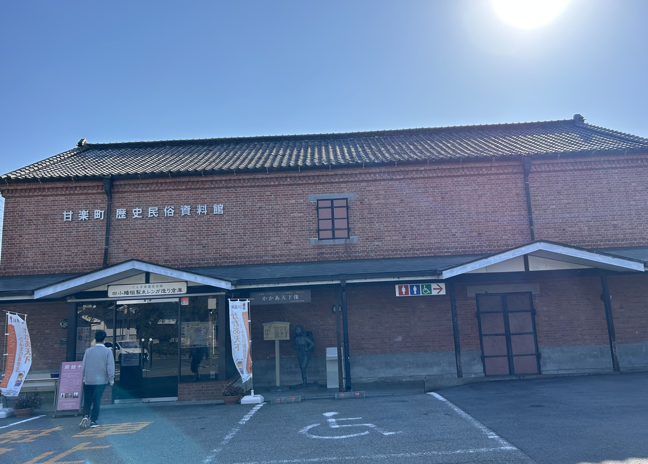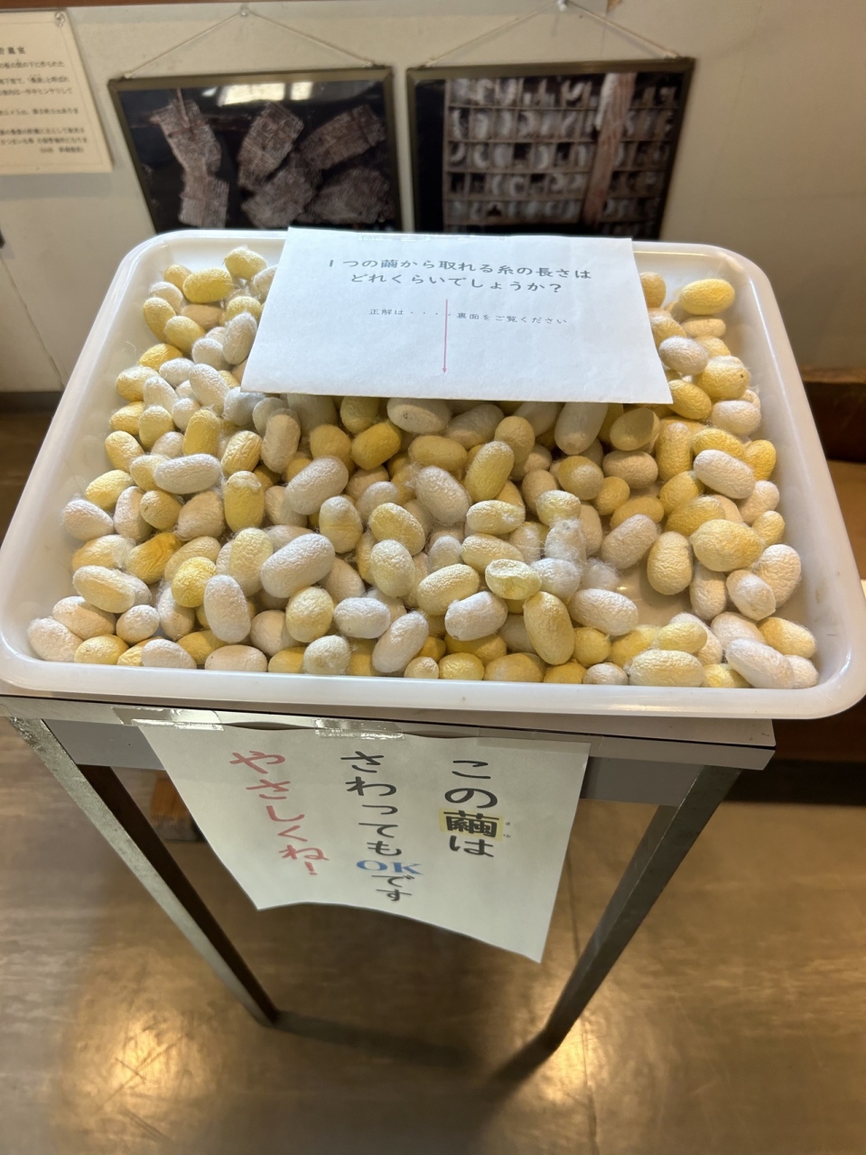 大正15年に甘楽社小幡組製糸工場の繭倉庫として建設。養蚕農家が衰退した後赤煉瓦造りの建物を甘楽町が昭和59年に買い取り資料館とした。一階には養蚕に使われていた道具や富岡製糸場絵馬、織田信雄肖像画、などの貴重な当時のものが置かれている。蚕が天井に繭を作ってある光景には驚かされた。
