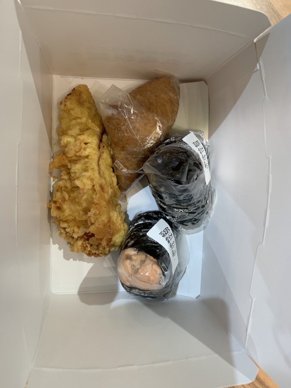 うどんではなくて天ぷらとおにぎりが食べたくて、箱に入れてのテイクアウトしました。