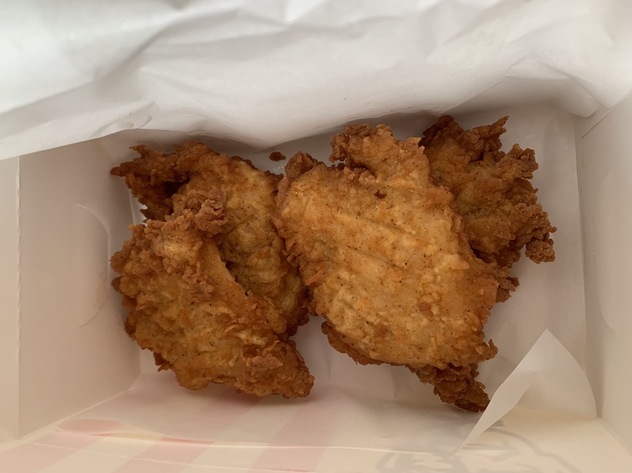 どうしても食べたくなるケンタッキーフライドチキンです。セットは欲しくなくチキンだけ買いに行きました。子供達で賑わう夏休み終わりのランチ時でした。心なしか小さく成ったと思われるお肉ですが家で唐辛子をまぶし美味しくいただきました。
