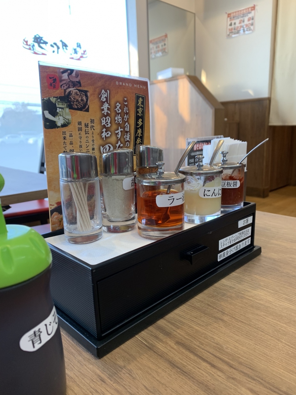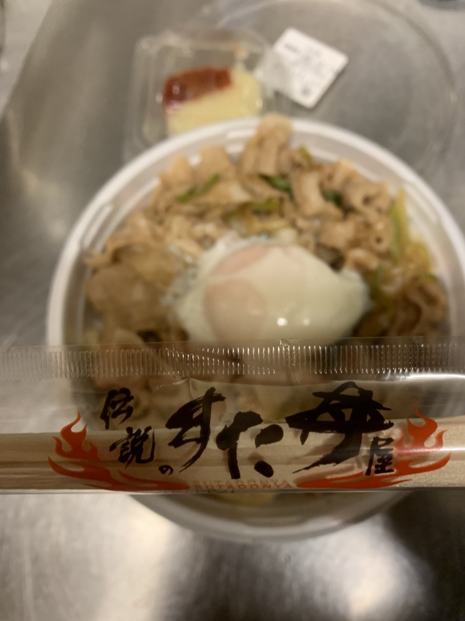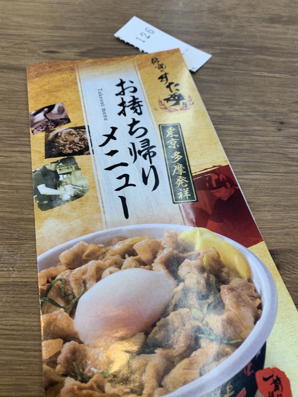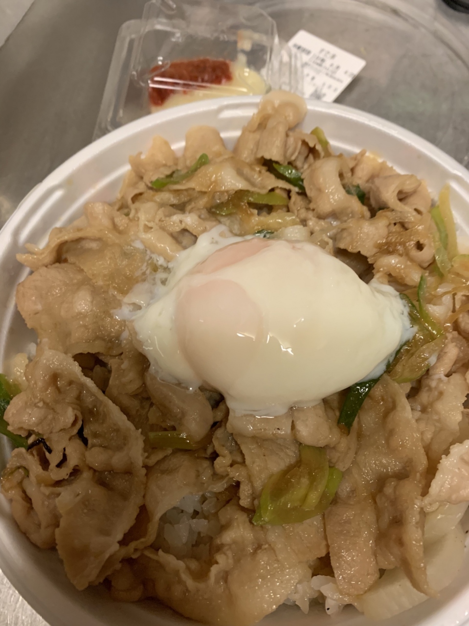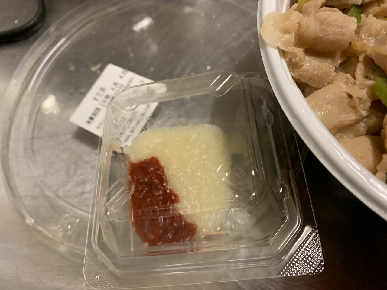女子一人では食べづらい方はお持ち帰りもできます。食券を購入して待ちます。ボリュームがあるのでお持ち帰りにすると、豚丼、温泉卵、まだご飯がたっぷり入ってます。二回に分けて食べられます。今回はニンニクと豆板醤を少しいただいて帰りました。