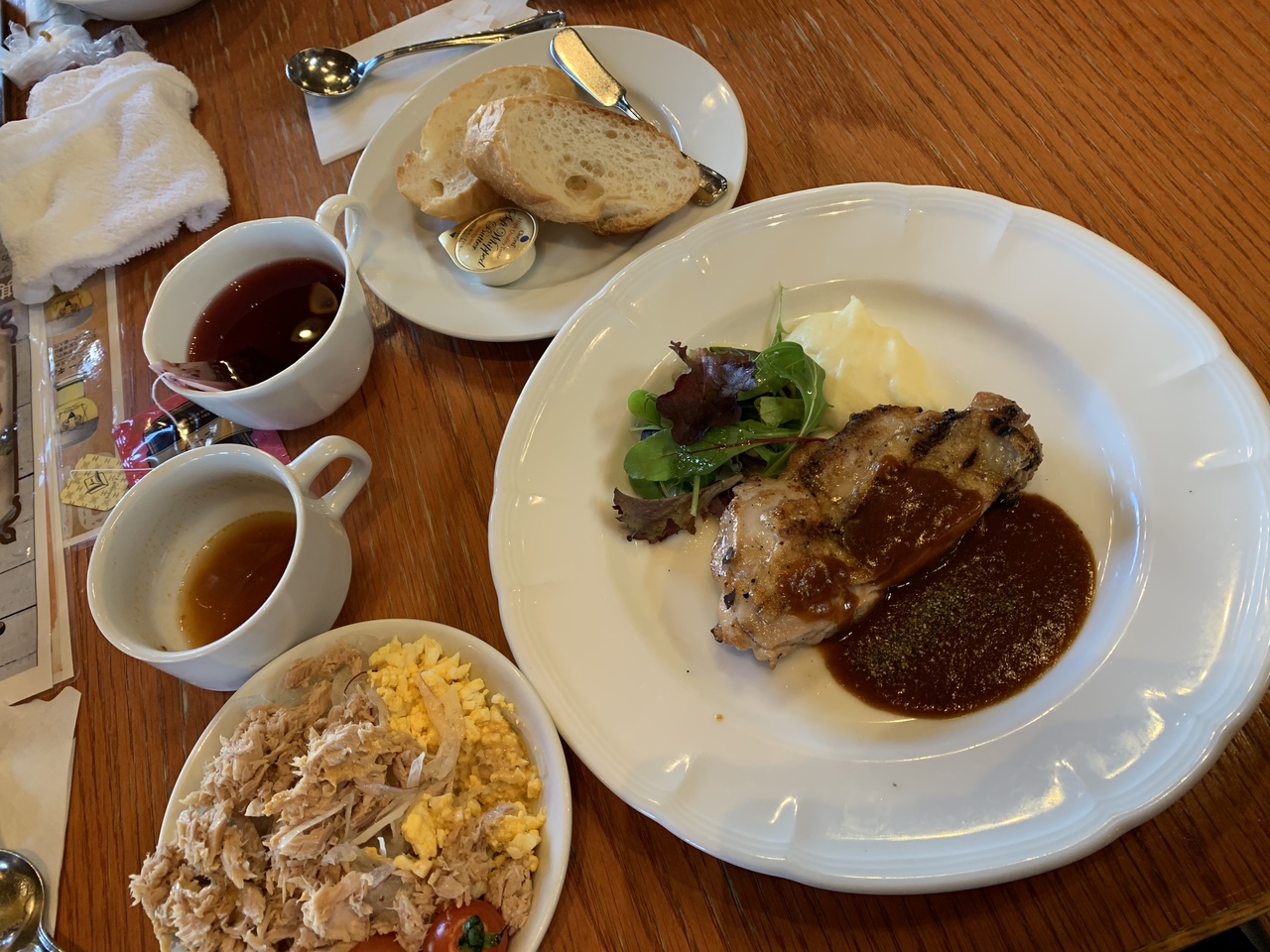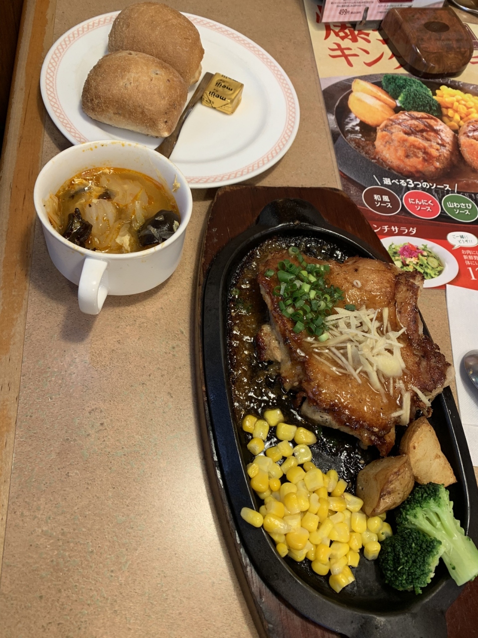 いつかの金券でランチをしました。安全交通SDカードもあればドリンクバーが付けられます。とてもお得です。チキンは皮はパリパリでジューシーでした。ランチスープは具沢山、トマトとキャベツと卵のスープでした。