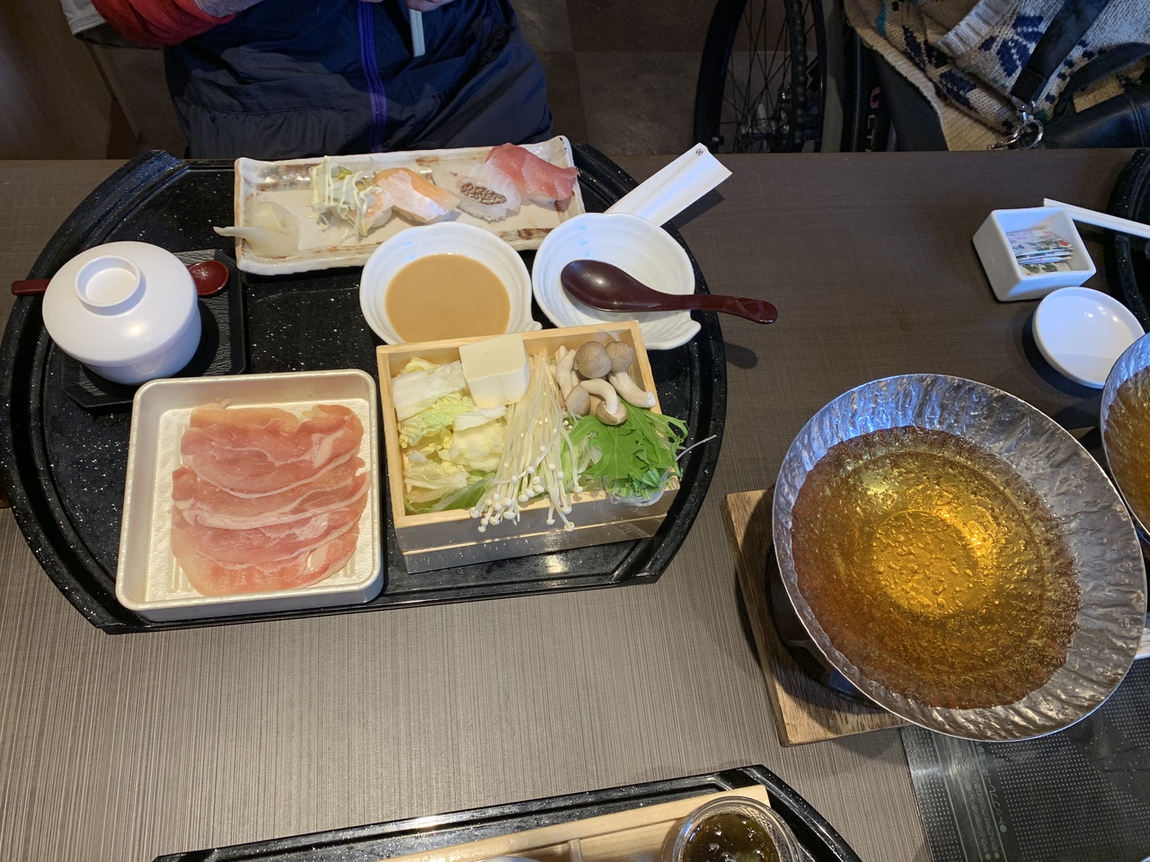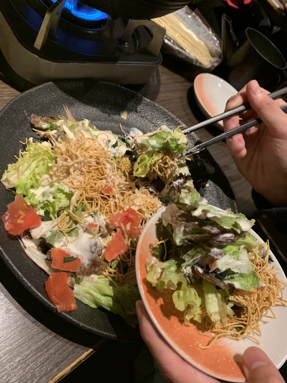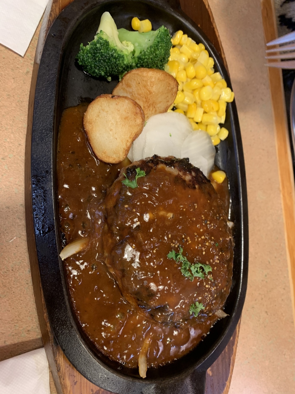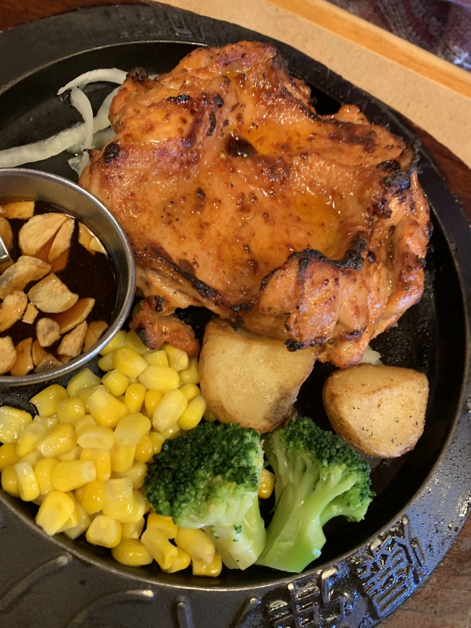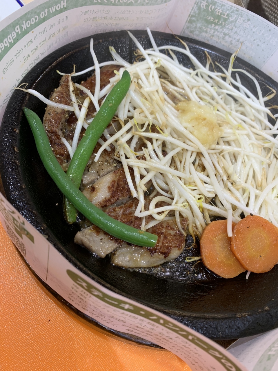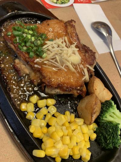 サーロインステーキを頼みましたが、小さいのでお箸で食べられます。鉄板熱々で自分で焼いて食べる感じです。もやしが沢山入っていて受け取りのところにニンニクが置いてあるので追加して食べました。美味しかったです。