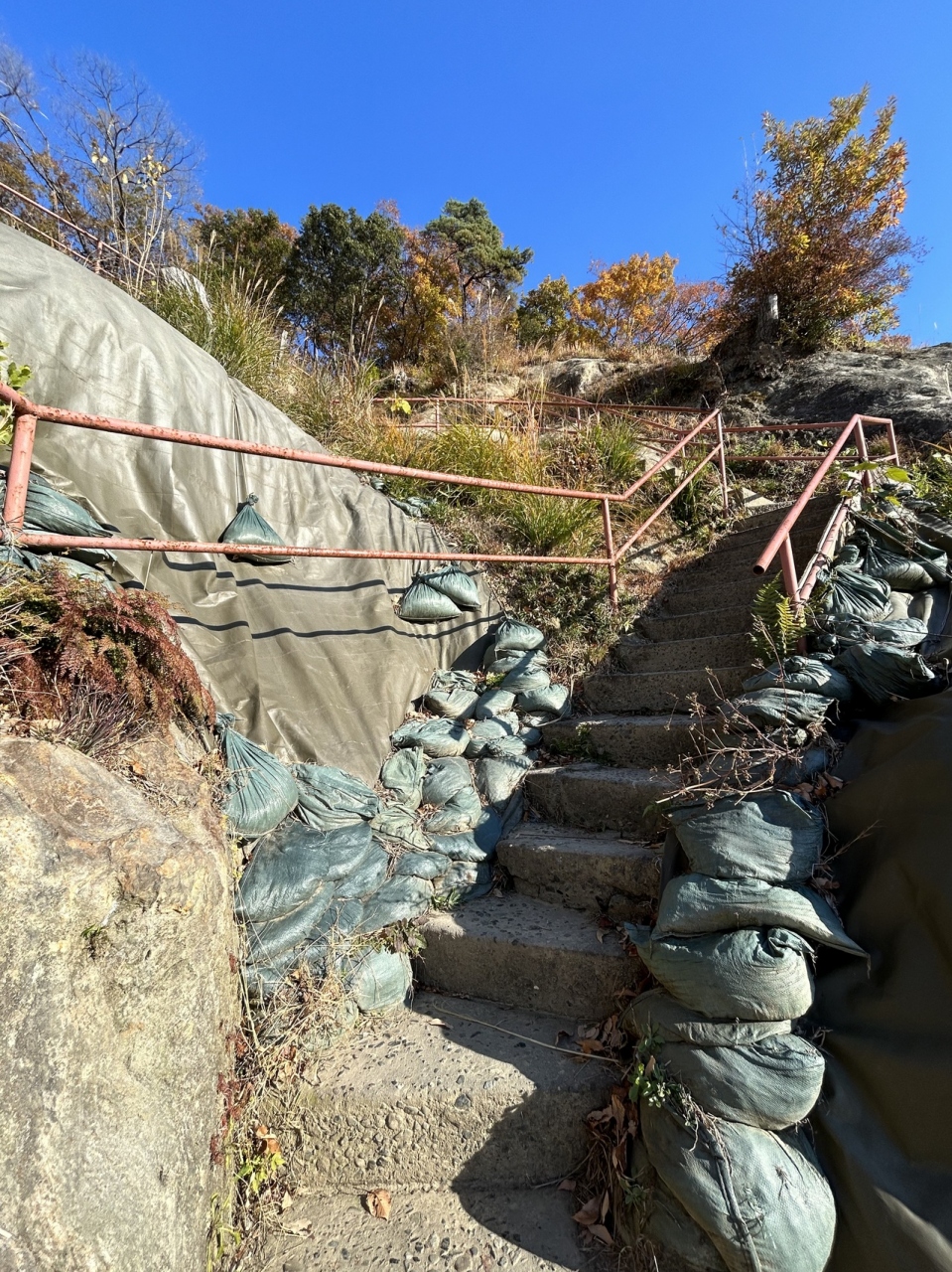 明治20年1887年東京帝国大の坪井正五郎により237基の横穴を発堀した。天狗の開けた穴と恐れられていた為木や草で覆われてしまっていた。 当時は住居か墳墓か?論争がありその後古墳時代の横穴式石室と同じで墓と落ち着いた。 中は棺座かんざが設けられそこに棺が置かれた。 閉塞石で閉じられていたが追葬も行われていた。 今の⚪︎⚪︎家の墓 みたいな感じだろうか。 太平洋戦争で地下軍需工場がダイナマイトを用いトンネルが造られ横穴墓は壊され今は219基となっている。 劣化が進み手すりも錆びていて急傾斜地のため登るのは思ったより大変だった。 近くには松山城跡もある。