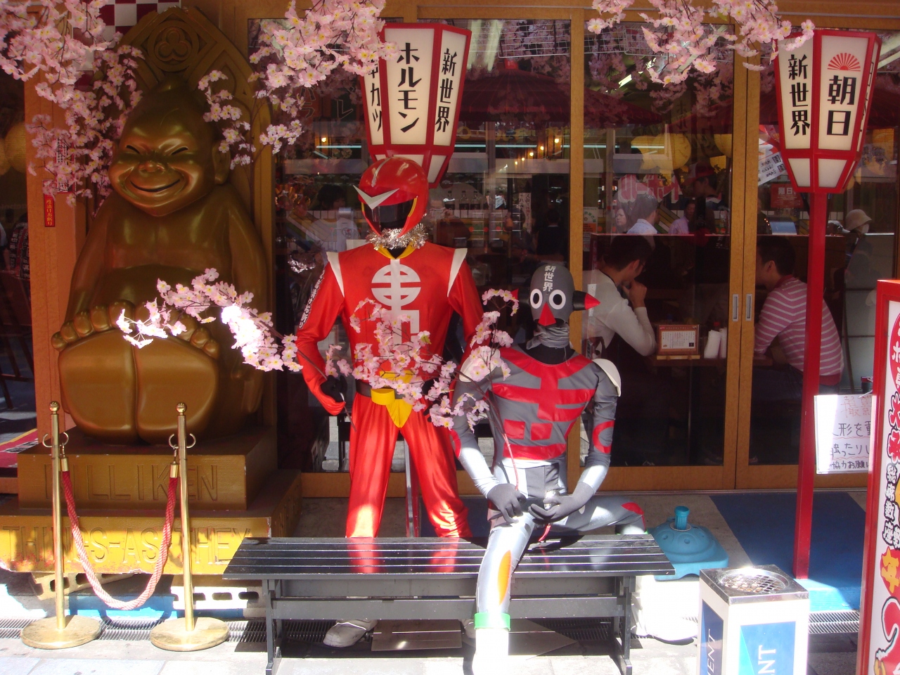 非常に面白い通りです場所です。何より面白いのは通りにある飲食店の外観やオブジェクトです。ヒーロー戦隊や巨大なフグ等見ごたえは間違いなくあります。