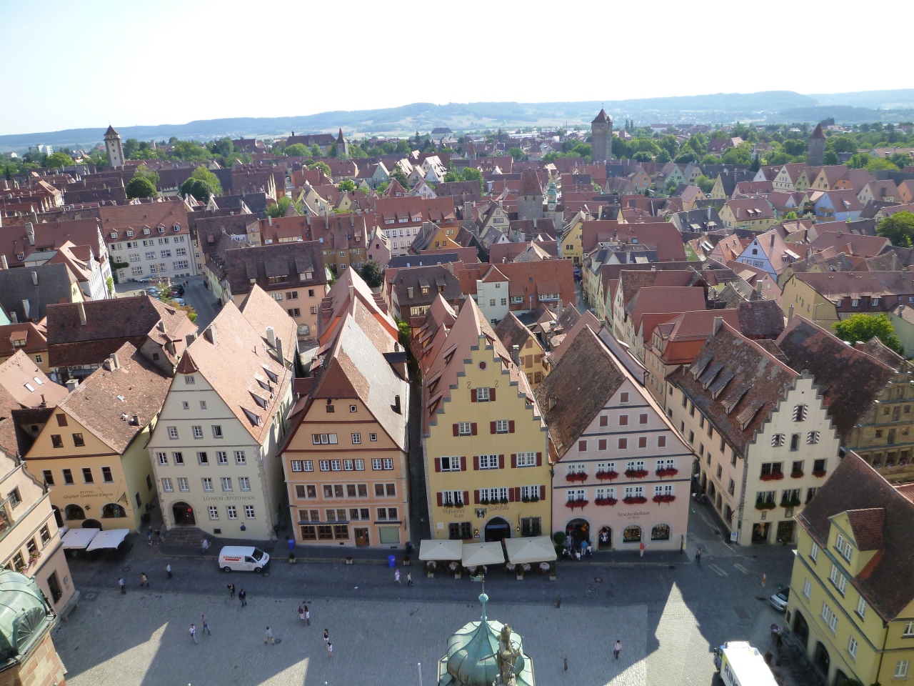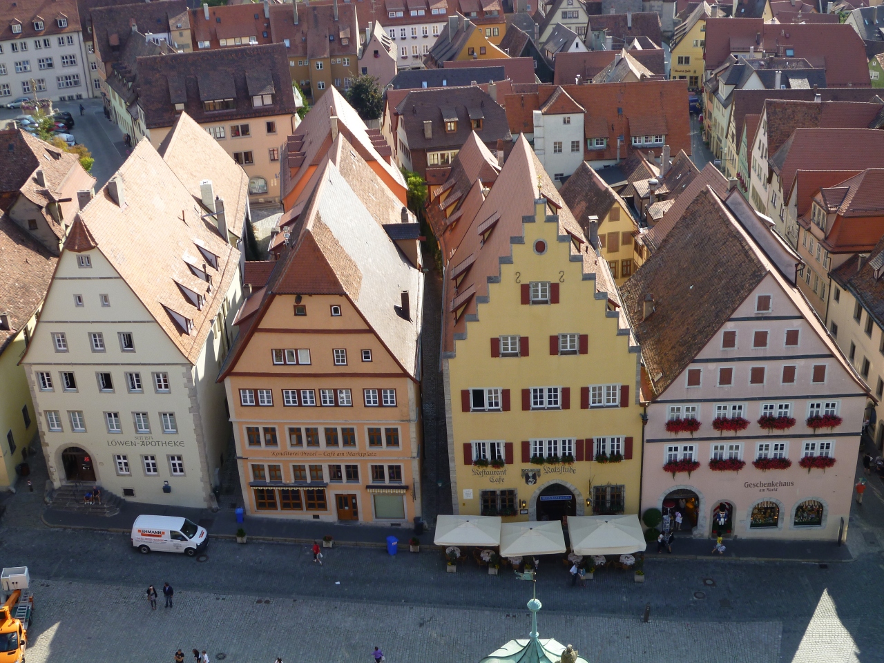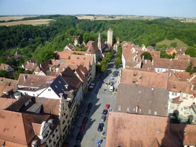 ローテンブルクを訪れたら城壁に上っての観光がお勧めです。城壁から眺める街並みがとてもきれいです。城壁の通路は狭いので、すれ違う時はお互いに譲り合って通行します。城壁に上がる階段は大きな塔の近くに有ります。時間があればぜひ上ってください。