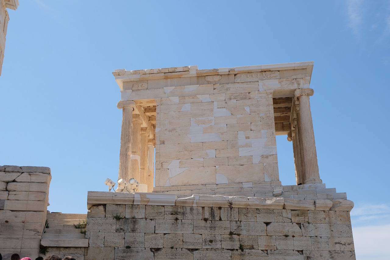 アクロポリスの入り口、プロピュライオンの南に両面列柱式の愛らしいアテナ・ニケ神殿がある。前面に4メートルのイオニア式列柱が4本、背面にもイオニア式列柱が4本ある。神室には右手にザクロ、左手に兜を持ったニケの木像が設置されていた。この木像には翼がなく勝利の女神のニケが飛び去らないためと説明されている。列柱の上には3層のアルキトラブがありその上の装飾帯はロンドンに持ち去れらたため現在はセメントで作られたコピーが取り付けられている。急斜面に面した部分には手すりが取り付けてありその表面にはさまざまな勝利の女神が描かれていた。その最も有名なのが新アクロポリス博物館に保存されているサンダルを脱ぐニケです。