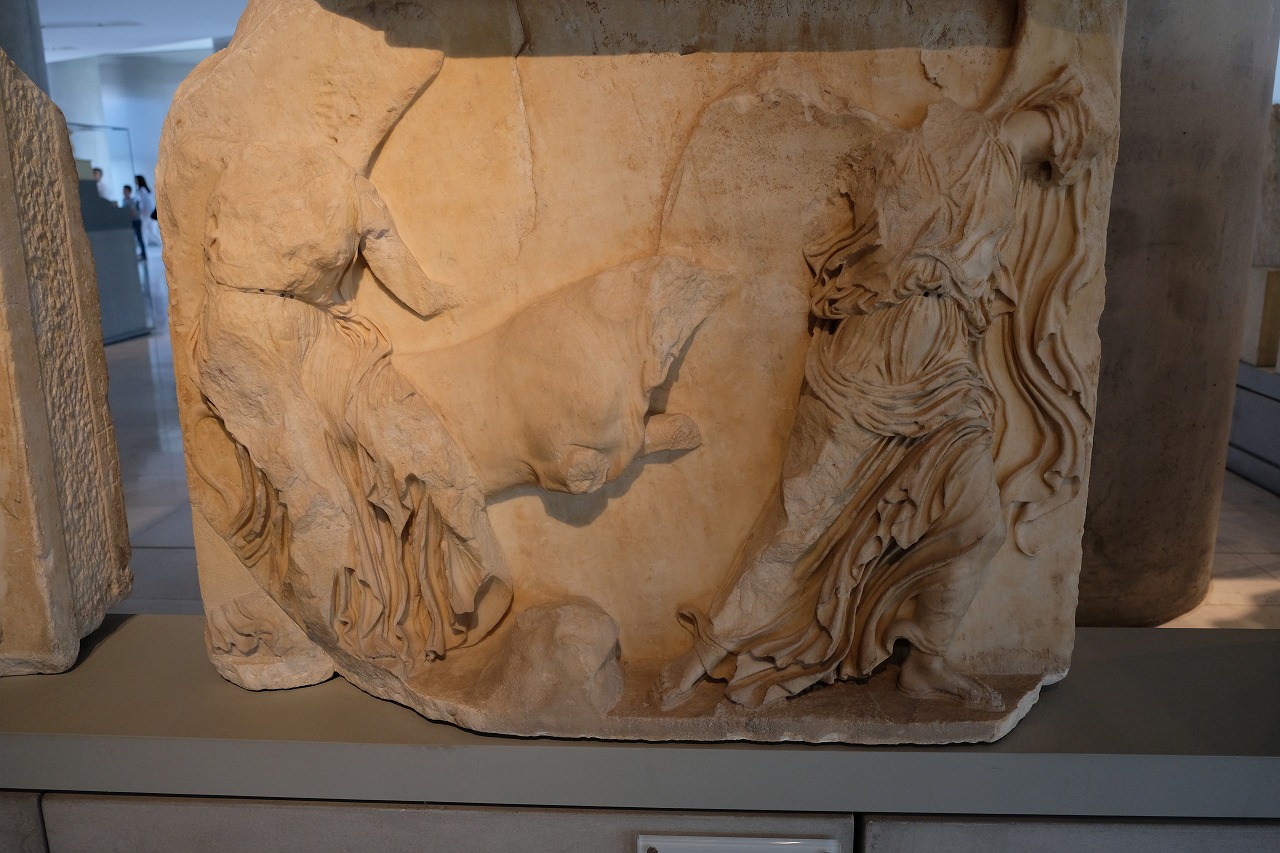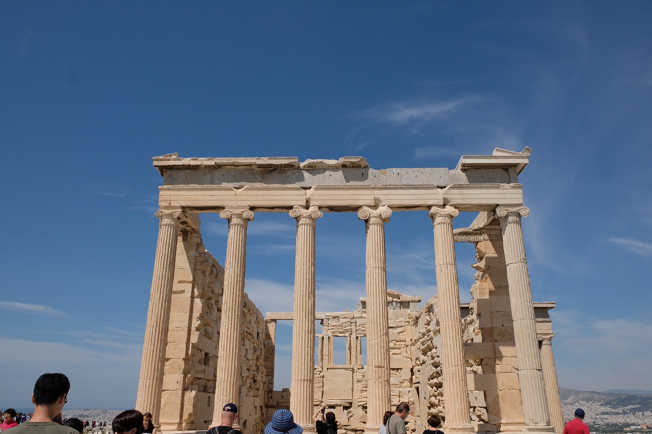 パルテノン神殿の北側にちょっと複雑な形状のエレクテイオンがある。東側には5.6メートルのイオニア式列柱6本のプロナオスがありその奥に神室がある。神室にはかつてはアテナ・ポリアス像が設置されていた。神室の西には壁を挟んでエレクテイオンがありさらにその西には4本の半列柱を挟んでパンドロセイオンがある。エレクテイオンはポセイドンを祀る神殿で、パンドロセイオンはアテナが槍で植え付けたオリーブの樹があったという神話があり、現在はその神話にちなんでオリーブの樹が植えられている。エレクテイオンの北側には6本のイオニア式列柱で飾られた豪華な玄関があり、ポセイドンの聖なる塩の泉がある。これはポセイドンと女神アテナが賭けをした際にポセイドンが三叉の矛で大地を突き刺して塩の泉を紛失させたという神話がある。エレクテイオンの南には出窓のようにカリアティディスの間がある。この間の柱は円柱ではなくコレの形状になっています。これらのコレ像は複製で、5体が新アクロポリス博物館に、1体が大英博物館にあるそうです。カリアティディスとは、カリュアイ村の少女たちがペリシャ人に奴隷として連れ去られ重荷を背負う罰を受けたことに由来するそうです。
