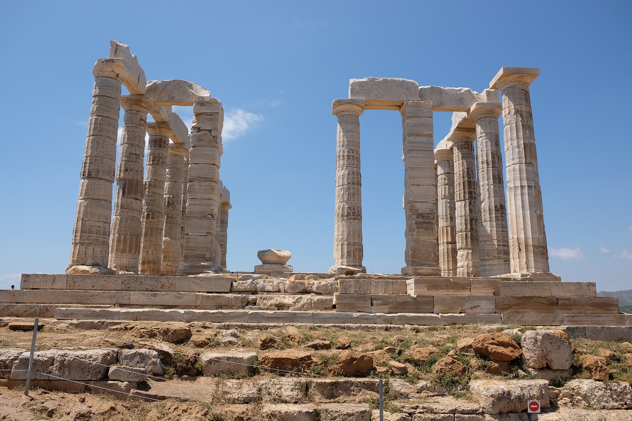 アッティカの最南端であるスニオン半島の終わりに、アテナイ人はアテナとポセイドンの2つの最も重要な神に敬意を表して聖域を建設した。ポセイドンの聖域は、アッティカの海岸の砦の中にある。アグリレザ産の白い大理石の神殿は、紀元前5世紀中頃に建てられた。それは紀元前6世紀後半にさかのぼる初期のポロス神殿の基礎の上に作られた。ポセイドン神殿はドーリア式神殿(31.12 x 13.47 m)で6 x 13の列柱があった。ドリア式に列柱の上部の装飾帯には、ケンタウルスとラピスの戦い、巨人と神の戦い、テセウスの労働の伝説から引用された題材のレリーフが飾られていた。