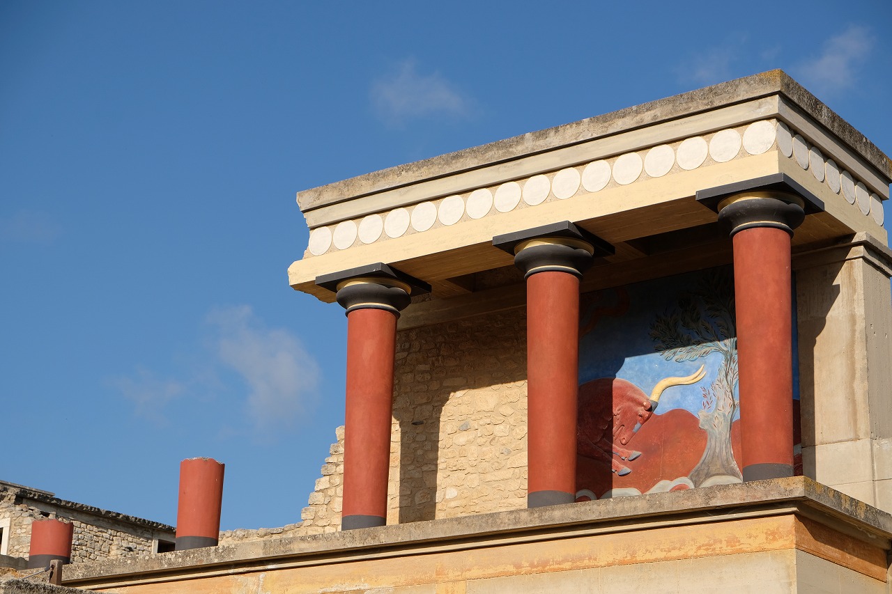 へラクリオンの港からバスで約30分でクノッソス宮殿跡に到着します。現在見ることの出来る建築物は土台部分を除きほとんどはコンクリートで再現されたものです。また壁画等の本物はイラクリオンの考古学博物館にあり、ここに飾られているのはすべてレプリカです。この地を発掘したエヴァンズの個人的な想像力で大胆に再現されているため建物はかなり怪しい雰囲気です。ただし土台部分だけの荒涼とした廃墟を見せられてもなんだこれってなりそうなのでこれはこれでいいのかもしれません。宮殿の柱は丸太を根の部分を上にして建てられていたそうですが、一本だけ当時のままの柱が発掘されて保存されているのですが3000年前の丸太とは思えないので本当かどうか怪しいです。