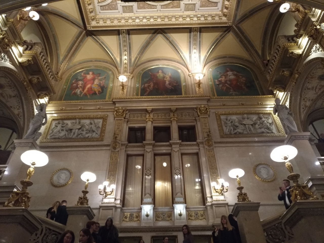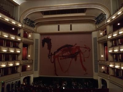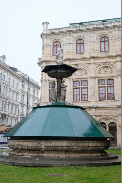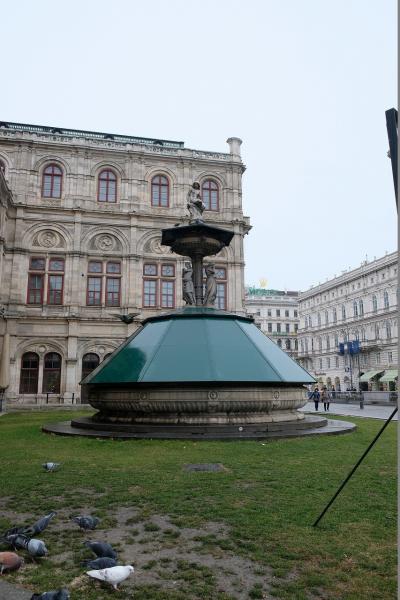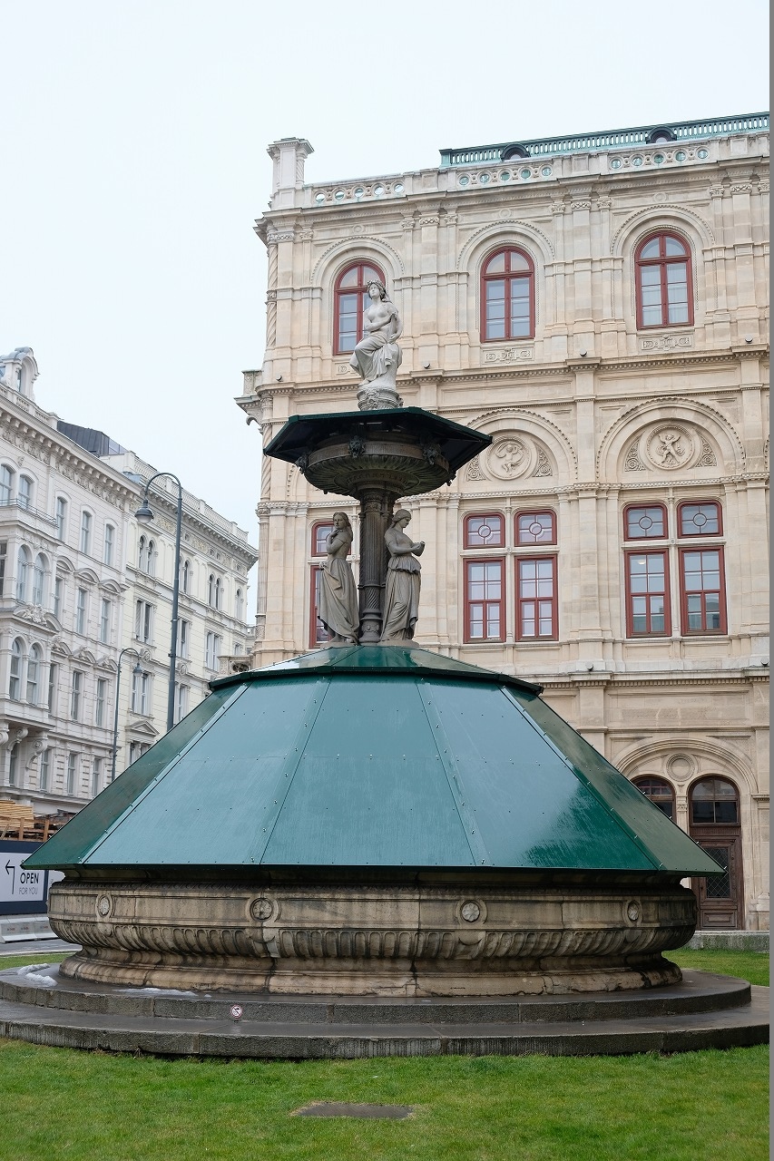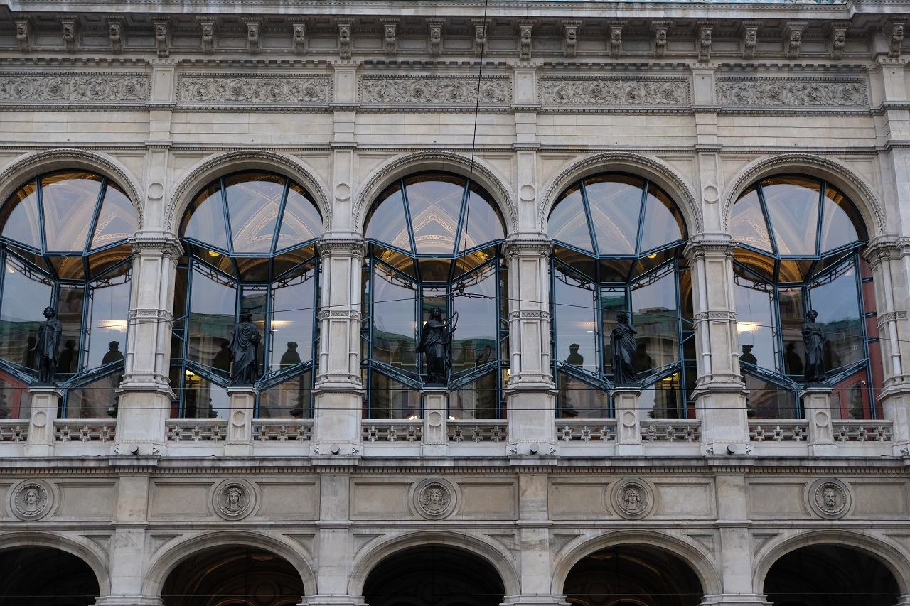 言わずと知れたウィ―ン国立オペラ座です。正面はルネッサンス様式のアーチ。アーンスト・ジュリアス・ハウネルによって作成された馬に乗った2人の騎手の像は1876年にロッジアのメインファサードに置かれました。これらはハーモニーと詩のミューズが率いるエラトの有翼の馬を表しています。ベランダの上のアーチには、ハウネルの5つの銅像があります。左から右へ、英雄、悲劇、ファンタジー、コメディ、愛を表しています。オペラハウスの左右には、ヨセフ・ガッサーの2つの噴水があり、左側には音楽、ダンス、喜び、軽快さ、右側には誘惑、悲しみ、愛、復讐の異なる2つの世界があります。