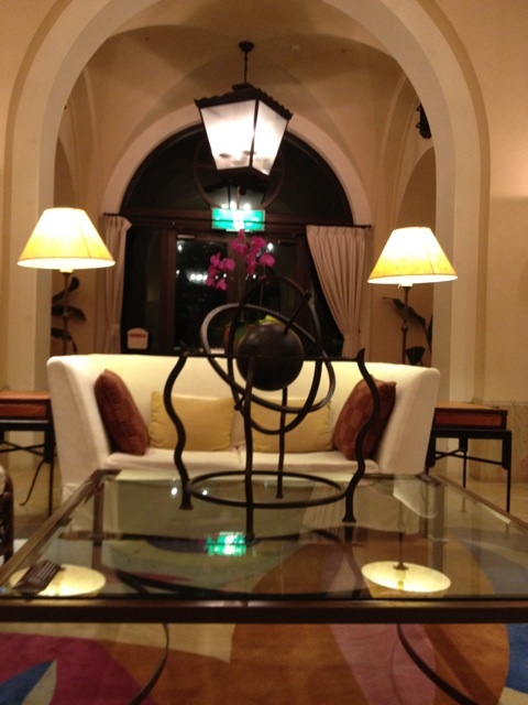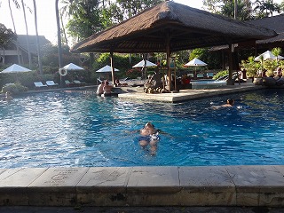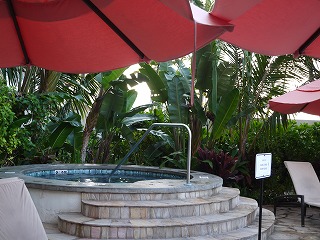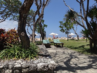ロビーからプールの出口は、空の青が バーンと目に入ってきます。