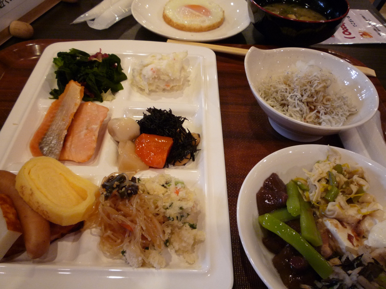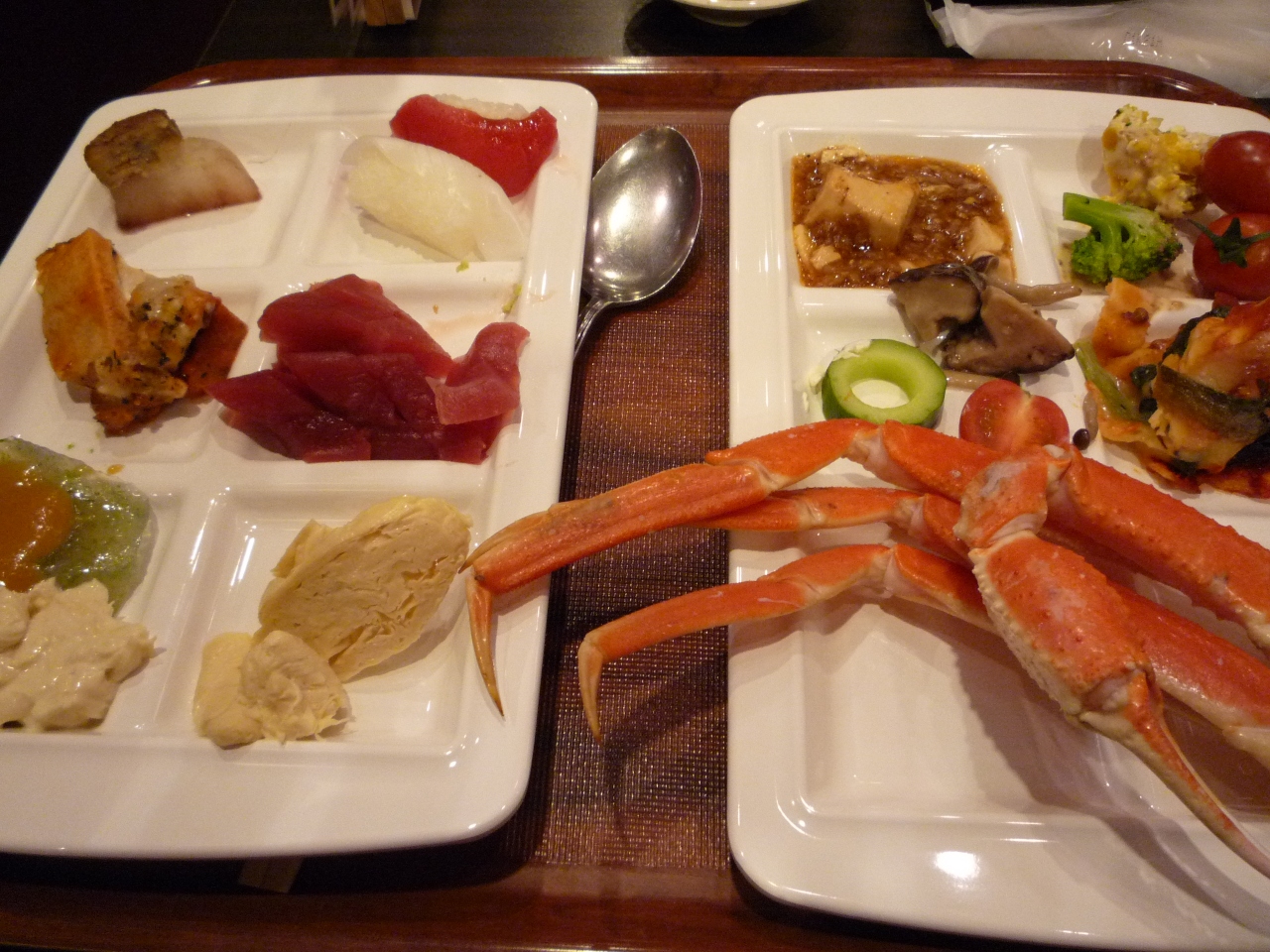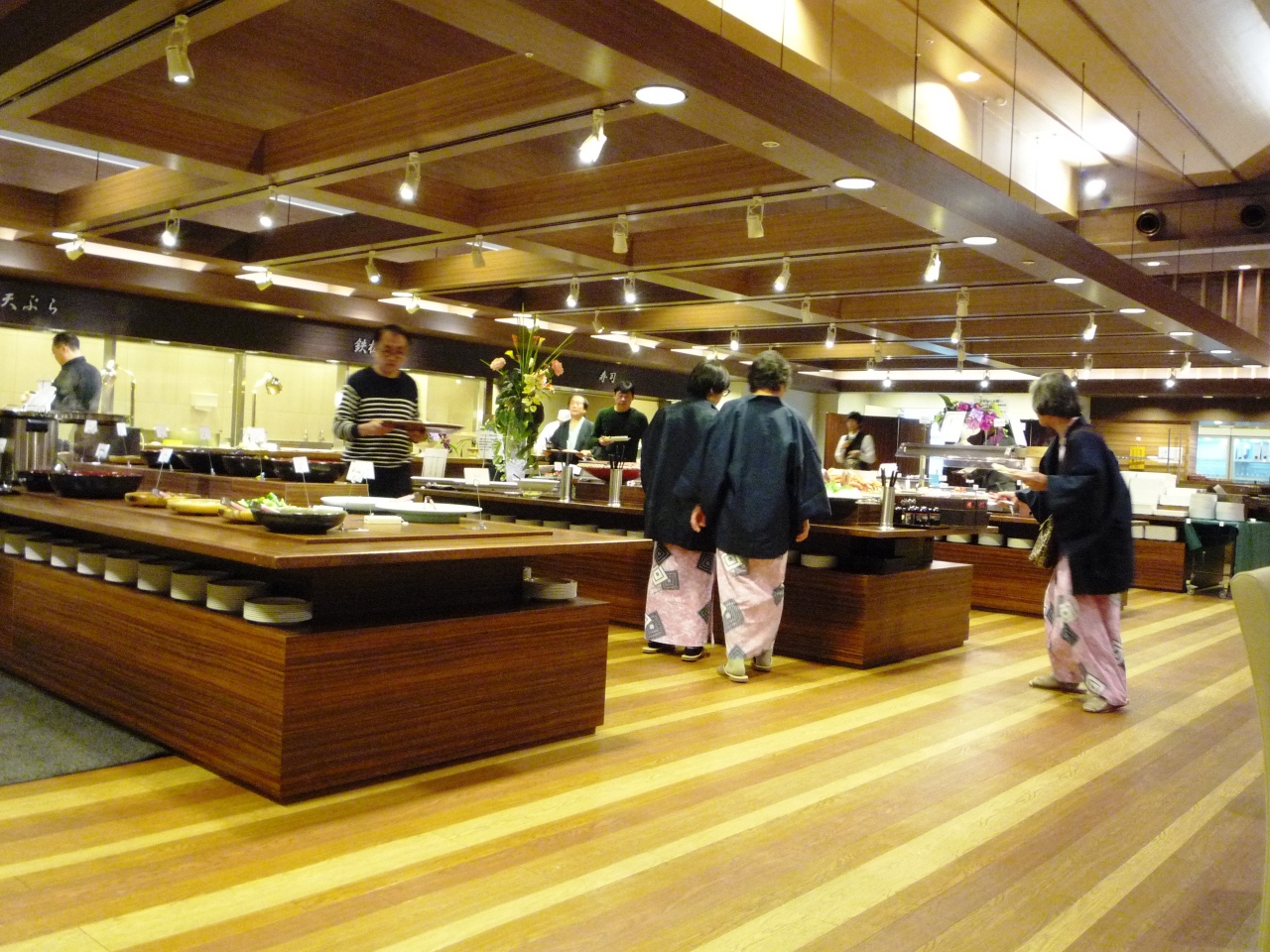 夕食朝食共にブフェです。夕食は種類が多くて一回で一通り食べるのは無理な位です。寿司は握ってくれます。ステーキは焼いて小口切りにして出しています。デザートケーキやアイスクリームもあります。二泊しましたが同じメニューでした。朝も夕食よりは少な目ですが充分な品数で二日とも同じメニューでした。私共には満足できる食事でした。
