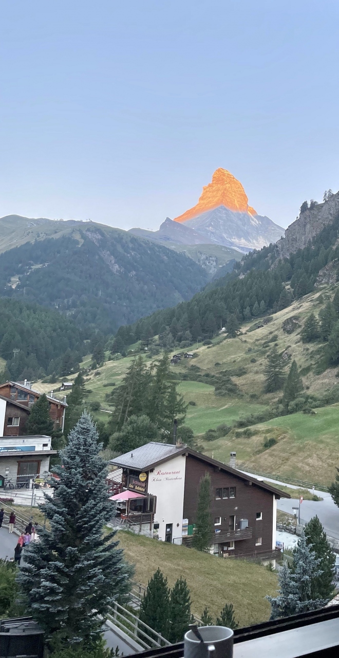 バルコニーから見られるので身だしなみ整える余裕がない寝起きでも朝焼けのマッターホルンが楽しめて楽でした。