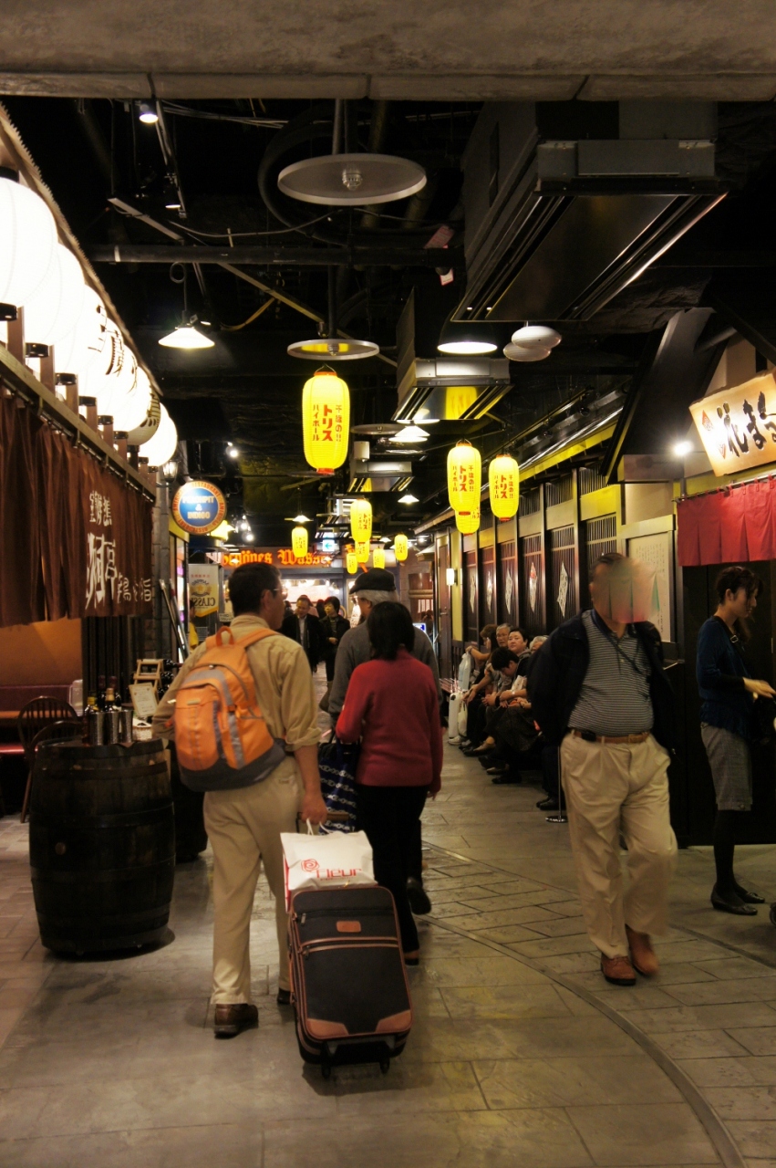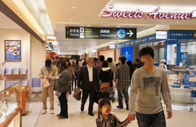 以前から、お土産物店の数は他の空港より群を抜いていましたが、リニューアルしさらに充実した空港になりました!施設内には、温泉、シアター、ロイズチョコレートファクトリーなどがあり、もはや空港というよりアミューズメントパークのよう...。実際に、近郊からの訪問客が多く、空港の駐車場は常に満杯状態だとか...。飲食店の数も増え、「やきとり」や回転寿司、ハイボールカフェなどが屋台風の路地に並んでいます。お土産の店舗数も多いので、みなさんかなり気合を入れてお買い物を楽しんでいました!