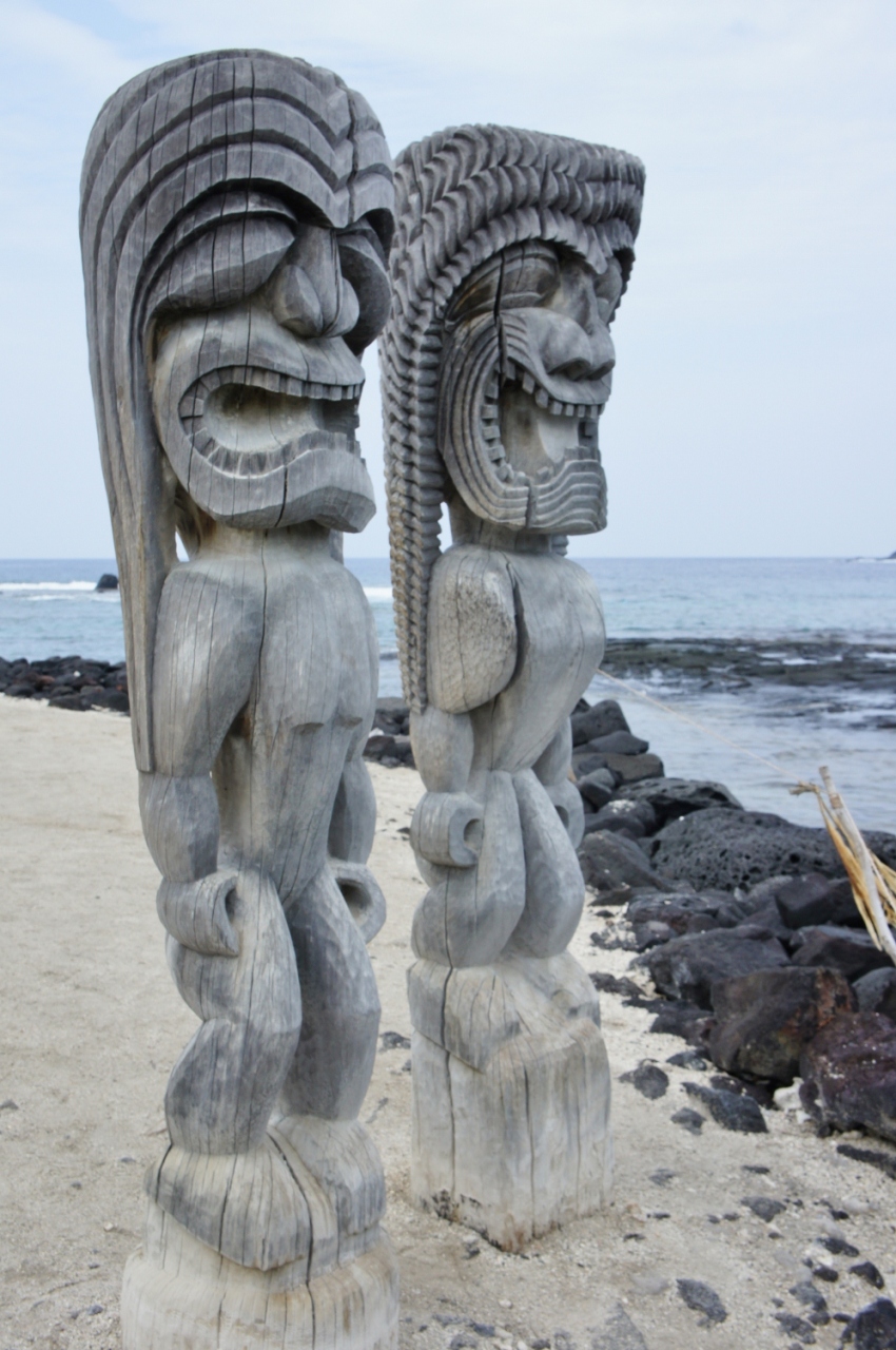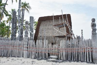 ハワイ島のパワースポットの1つ「プウホヌア・オ・ホナウナウ」に行って来ました!ハワイ島には、それこそ何回も行っているのですが、ガイドブック等では、ほんのちょっぴりしか紹介されていない為、今まで行ったことのなかったスポットです!プウホヌアとは、ハワイ語で「逃れの地」、「聖域」と言う意味で、国(NPS)が管理している公園の1つ。昔の住居やカヌーなどが再現され展示されている他、 ティキ(神像)や神殿なども建ち、昔のハワイの様子を見学することができます。凡人の私達には、パワーは感じられませんでしたが、きれいに整備された公園なので、もっと日本のガイドブックで紹介されてもいいのにな~、というのが正直な感想です