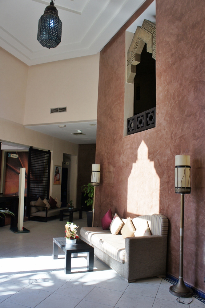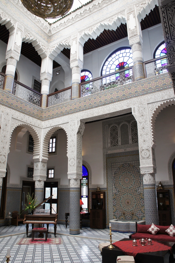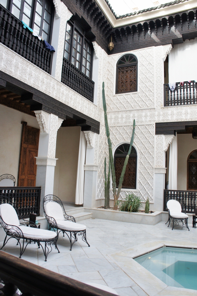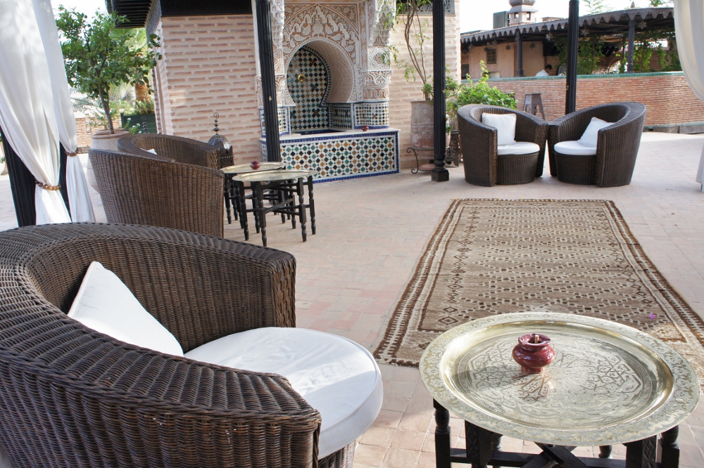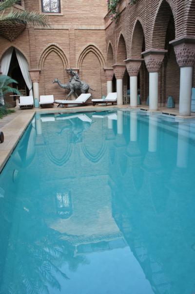 今回のモロッコ旅行で、最も気合を入れ奮発した豪華リヤド!喧騒のメディナから1歩リヤドの中に入ると、素晴らしい装飾の連続でくらくら...。部屋も凝りに凝った装飾で、かなりテンションが上がります!プールやスパなどの共有スペースも優雅で、大満足のハズだったんですが、2泊目に事件が発生しました!街歩きを終え、帰ってみると部屋の中がなんとも暑い...。温度計をみると32度!フロントに電話をかけ、温度を下げてもらうよう依頼し、ディナーへ出かけ、2時間後部屋に帰ってみるとやっぱり32度...。再度フロントに電話...1時間なんの対応もなし。ついにキレて3度目の電話で、やっとフロントマンが飛んで来ました。温度設定は17度にしてあると言うので、目の前に32度の温度計をつきつけ、やっとエアコン自体の故障であることを認識した様子。その後、午後11時30分に部屋を替わることに...。そして、もう1つの事件。部屋を替わるときにポーターが荷物を運んでくれたんですが、その際、主人のスーツケースの取っ手がはずれてしまいます。こちらが、はずれた取っ手に気付いたのはポーターが引き上げた後...。経年の使用によって不可抗力ではずれたのだとは思いますが、一切だまったまま部屋を退出するという姿勢はいかがなものでしょう...。施設は本当に素晴らしいのですが(エアコン以外)、ソフト面がかなりお粗末でした!もう2度と泊まらないと思います。