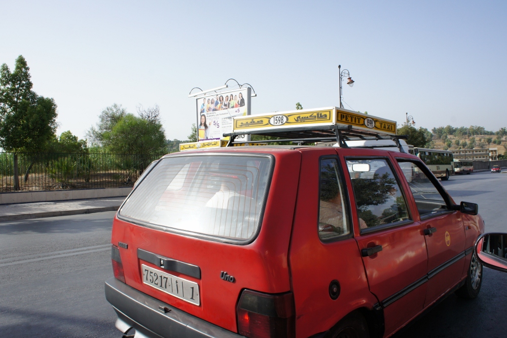 リヤド近くの広場から、駅へ行くのに利用しました。モロッコでは、近距離はプティタクシー、遠距離はグランタクシーと、完全に住み分けがされています。今回利用したのは、プティタクシー。メーターがついていますが、観光客と見るとメーターを使ってくれないケースが多いのですが、この日は幸い、ホテルのポーターさんが交渉してくれたので、メーターで行くことができました。駅まで15DH(150円)でした。