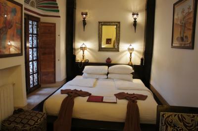 雑誌やTV番組で何度も見ていたリヤドですが、実際に1歩足を踏み入れたときの感動は、想像をはるかに上回るものでした!隅々まで装飾が施されたパティオは、もはや芸術の域!ハード面だけでなく、ソフト面も最高で、フロントのスタッフは皆フランスと英語が話せるので、観光などで不安な部分もそっとフォローしてくれます。リヤドは、メインストリートからほんの数分の場所にありますが、一切外の喧騒は入って来ず、静かなときが過ごせます...。タクシーが入って来れる広場までは徒歩5分程。立地も非常に便利なリヤドです!