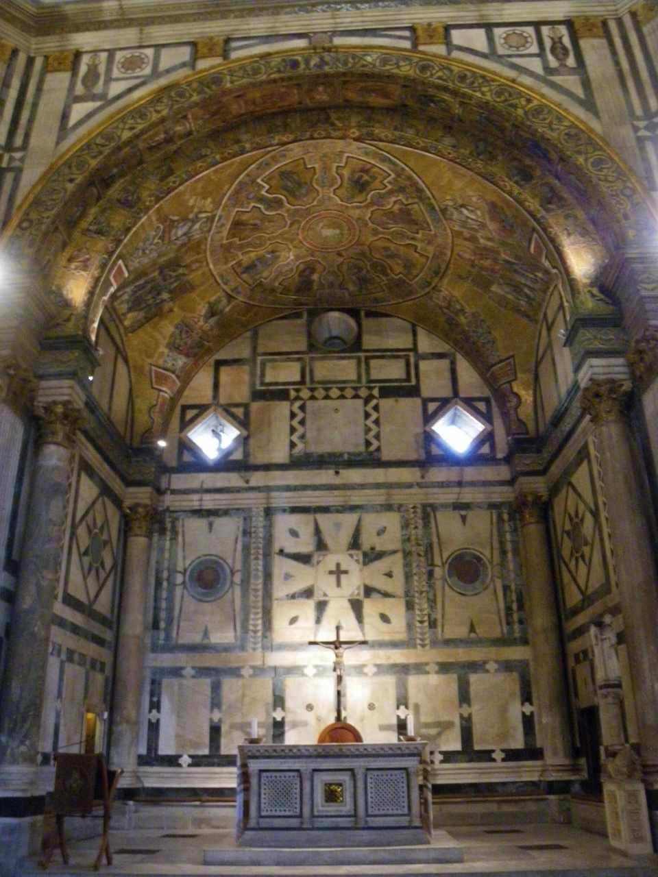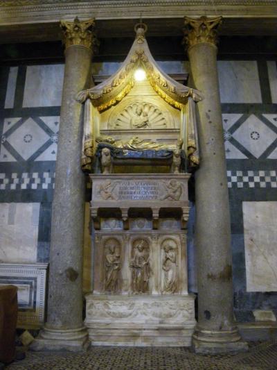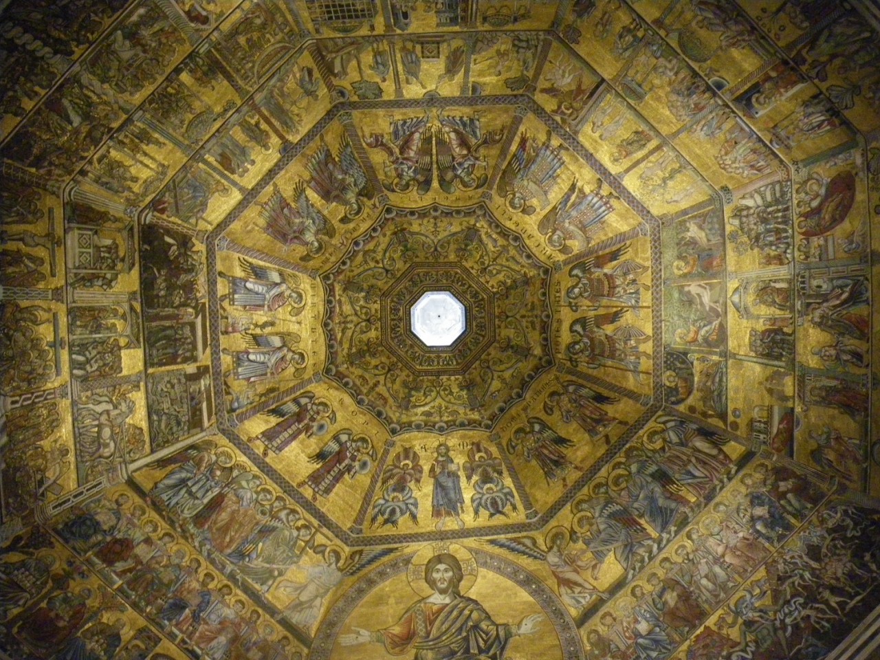 ミケランジェロが「天国への門」と呼んで賞賛したことで有名な扉のある洗礼堂。現在の扉はレプリカで、本物はドゥオーモ付属博物館に所蔵されているとか...。小さな八角形の洗礼堂ですが、中へ入って見ると、金地のビザンチン風モザイクのクーポラがきらきらとまず目に入ってきます。教皇ヨハネ23世墓碑もあり、小さいながら見所の多い洗礼堂です。午後からは観光客の列が洗礼堂をぐるりと囲む程混みますので、午前中の早い時間の見学がおすすめです!