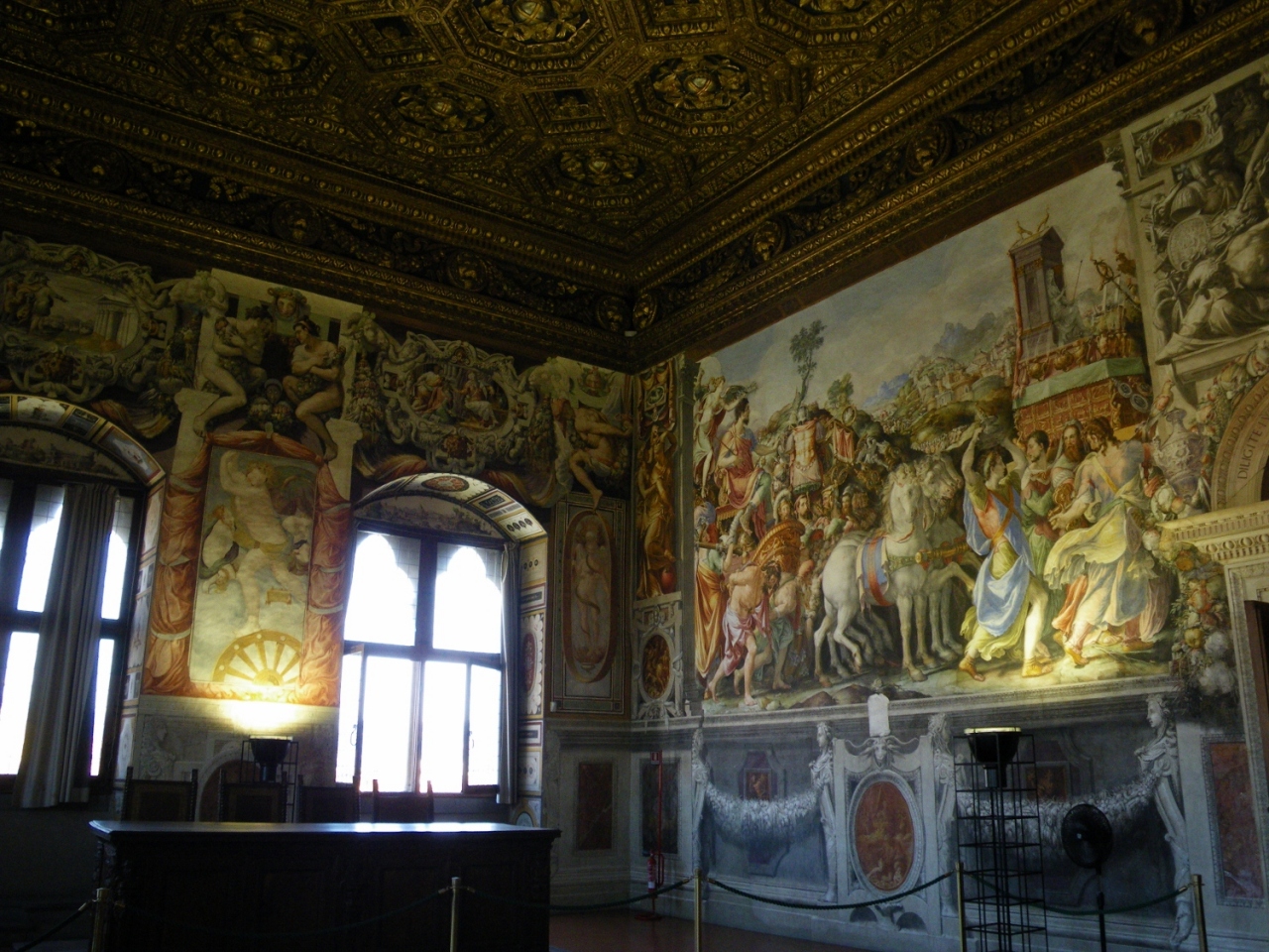いつ訪れても長蛇の列で毎回パスしてきた「ヴェッキオ宮」でしたが、今回は朝早い時間から並んだので無事入れました! 宮殿の中に入っても、チケット売り場に辿りつくにはX線検査&手荷物検査を受ける必要があり、1名ずつ検査を受けるので、列の進みはかなり遅いです。建物の中は、映画にも登場した「5百人広間」や、装飾の素晴らしい部屋がいくつもあり、じっくり見学するには半日以上かかりそうです...。ここでの結婚式も日本人に人気なんだとか...。なるほど、かなり素敵です!