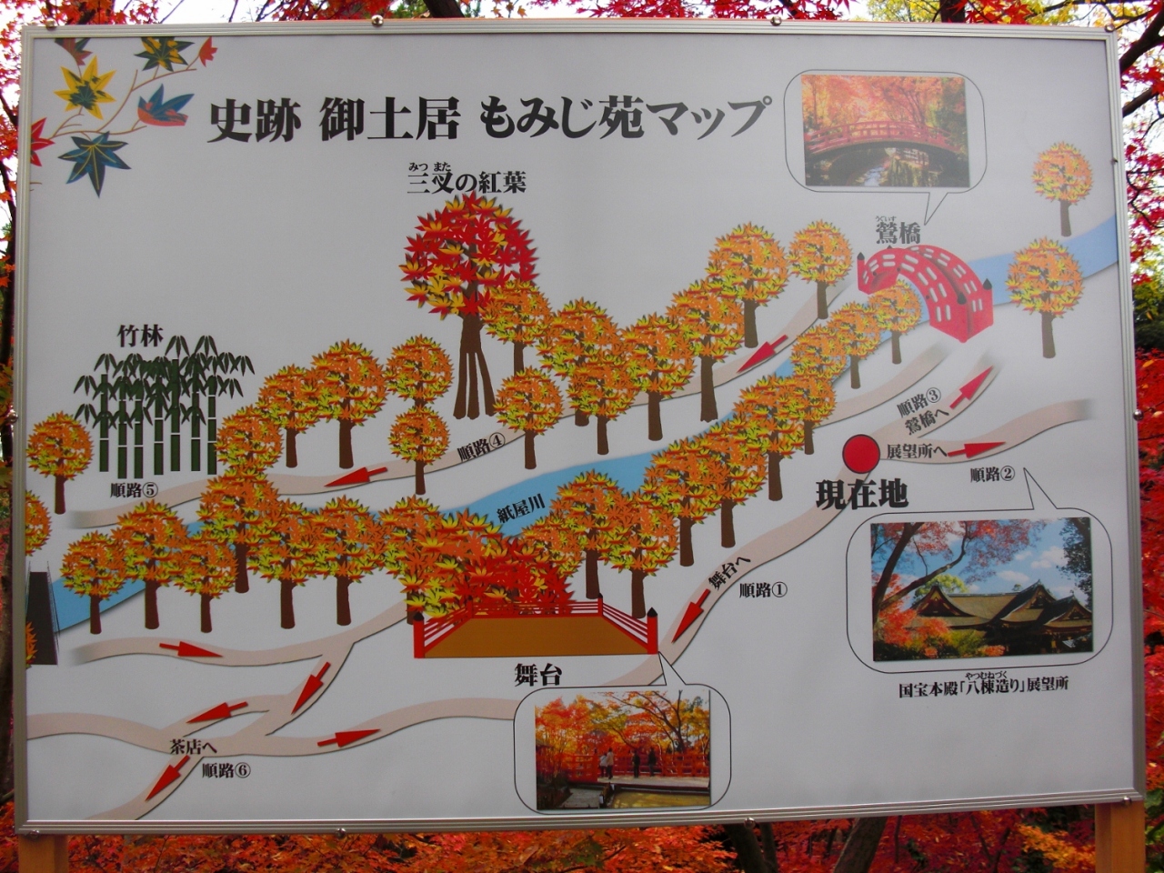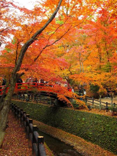 北野天満宮内にある2007年に公開されたばかりの新しい「もみじ苑」は、他の京都の観光スポットに比べると、まだ人も少なくオススメです♪ 特に太鼓橋の上から見る紅葉の様子は圧巻で、左右の土手から燃えるような紅葉の枝々が川に覆い被さり、川面にも燃え立つ紅葉の色が反射しています!そんなに広い敷地ではないので、すぐに1周し終わってしまうのですが、さっと過ぎてしまうには、もったいない程見事な紅葉なので、ゆっくりベンチに腰掛けて、紅葉散歩の1日を楽しんでみてください♪