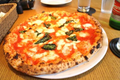 ニセコの有名ピッツァテリア『デルソーレ』に行って来ました。完全予約制のお店で、私も1週間前に予約を入れておきました。ニセコのペンション村の中にある、こじんまりしたお店なんですが、シェフはナポリ帰りだそうです。私は、『マルゲリータ』を!どのお店でも、ナポリピザ屋さんで食べるのは、マルゲリータのみと決めております。素材のシンプルさが、却って美味しさを際立たせている気がします。主人は、『マルゲリータのハムのせ』をオーダー。これも、ハムの塩気とトマトの甘さのバランスが抜群でした。
