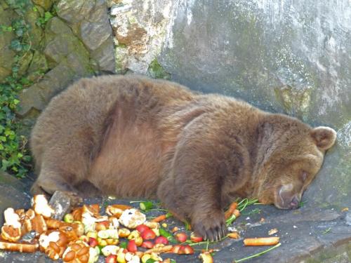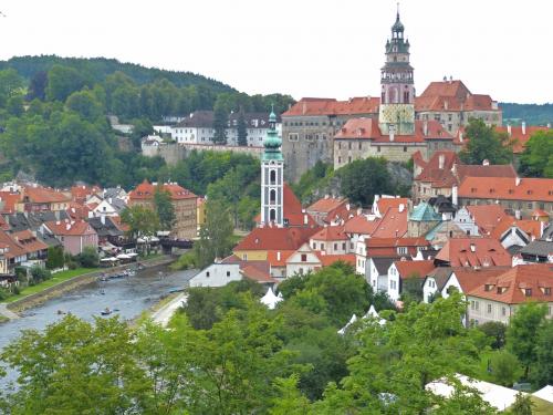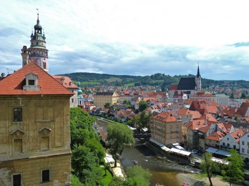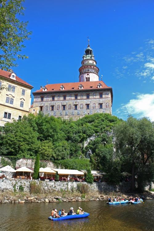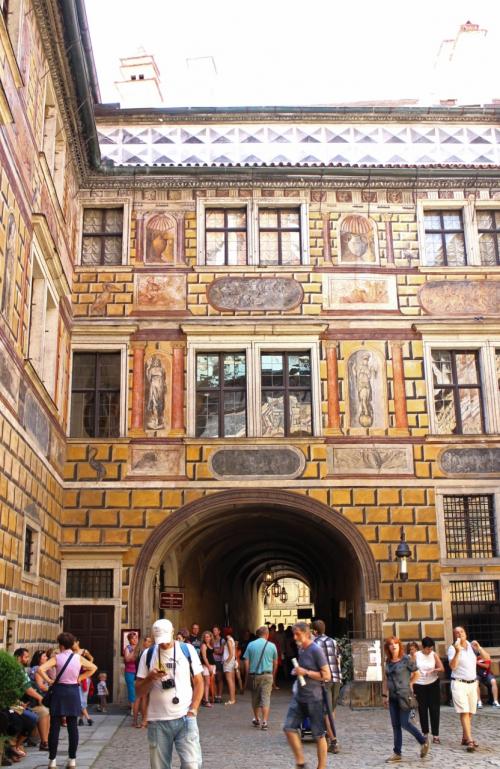 歴史地区からどんどん坂や階段を昇ると、ようやく『チェスキー・クロムノフ城』に到着します!人気の観光地なのか、とにかくすごい観光客の数にびっくり!皆さん、なぜか左右のお堀を見ているので、我々も見てみると、たくさんのエサに囲まれて幸せそうなくまさん発見!その昔、王様が狩りに出た際、くまさんと鉢合わせし、逆にくまさんが城に王様を追っかけて来たというエピソードがあり、それ以来飼われているらしいです。お城の壁の装飾は、彫刻ではなく、すべて描かれたもの。だまし絵の数々に見入ってしまいます。お城の中を見学するツアーもあるのですが、撮影禁止ということで、今回はパス。お城からの眺めを楽しむだけでも十分満足できました。
